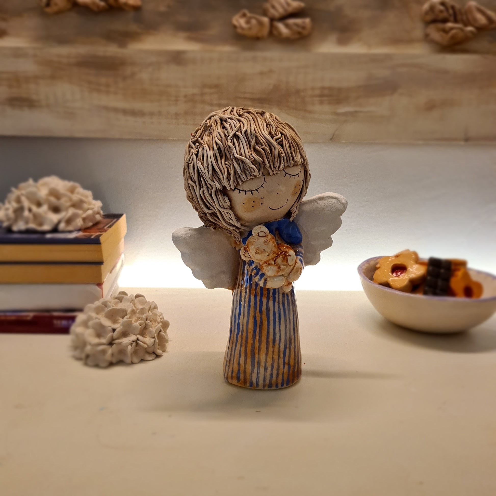 Ovaj ručno izrađeni keramički anđeo donosi toplinu, nježnost i osmijeh u svaki prostor. S anđeoskim krilima, zatvorenih očiju i osmijehom punim mira, kao simbol nježnosti i zaštite.