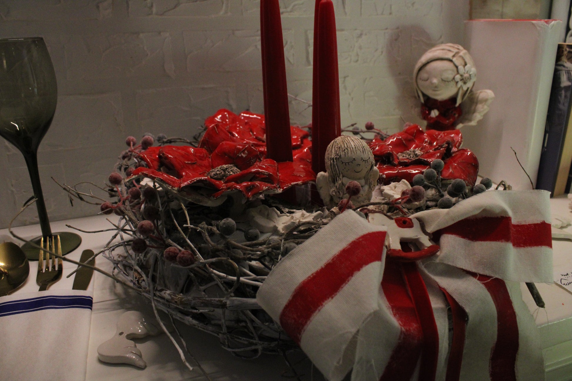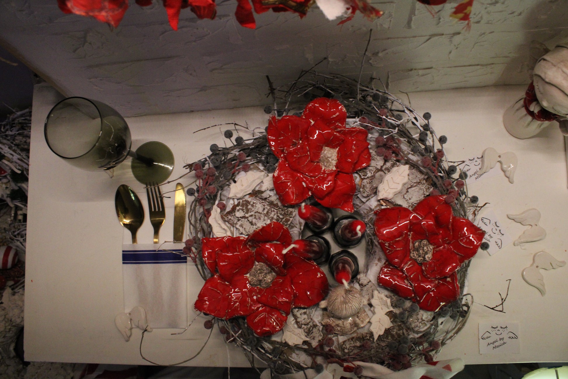 Ovaj luksuzni adventski vjenčić izrađen je ručno od kvalitetne bijele gline, s velikim ručno modeliranim cvjetovima božićne zvijezde u intenzivnoj crvenoj glazuri. Svaki je cvijet oblikovan i glaziran pojedinačno, što svaki vjenčić čini jedinstvenim umjetničkim komadom.