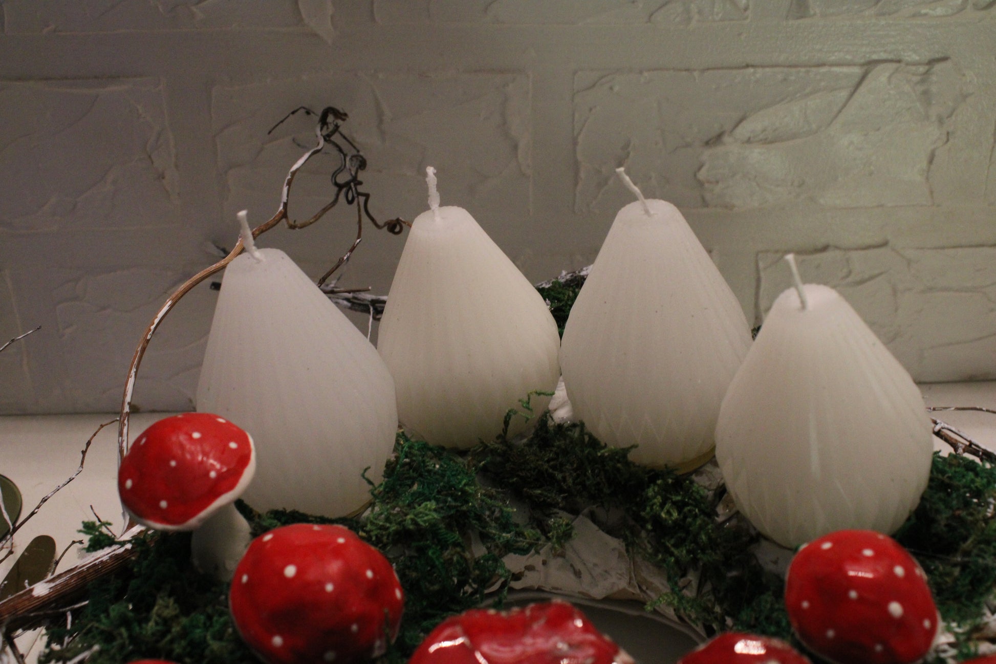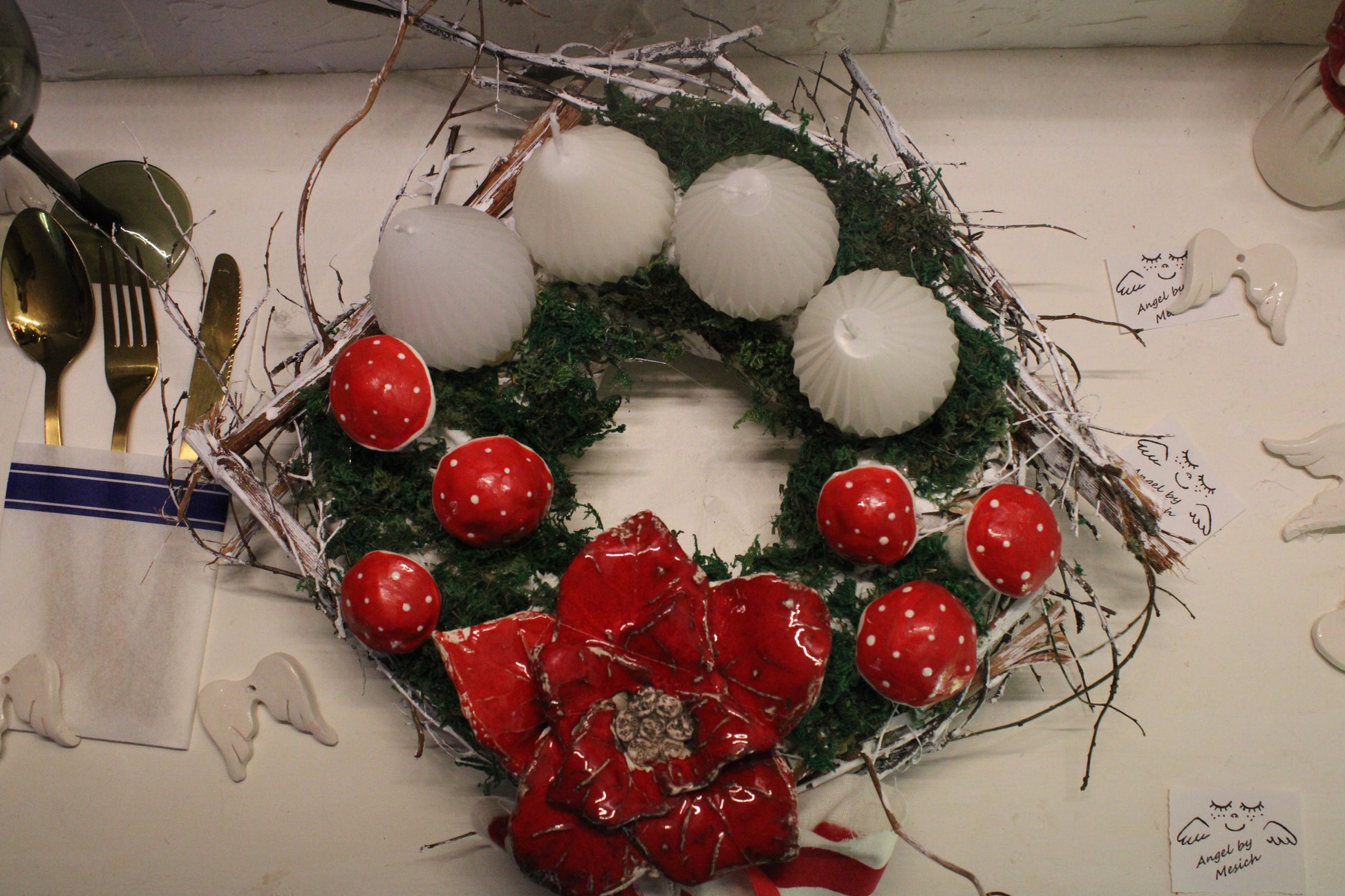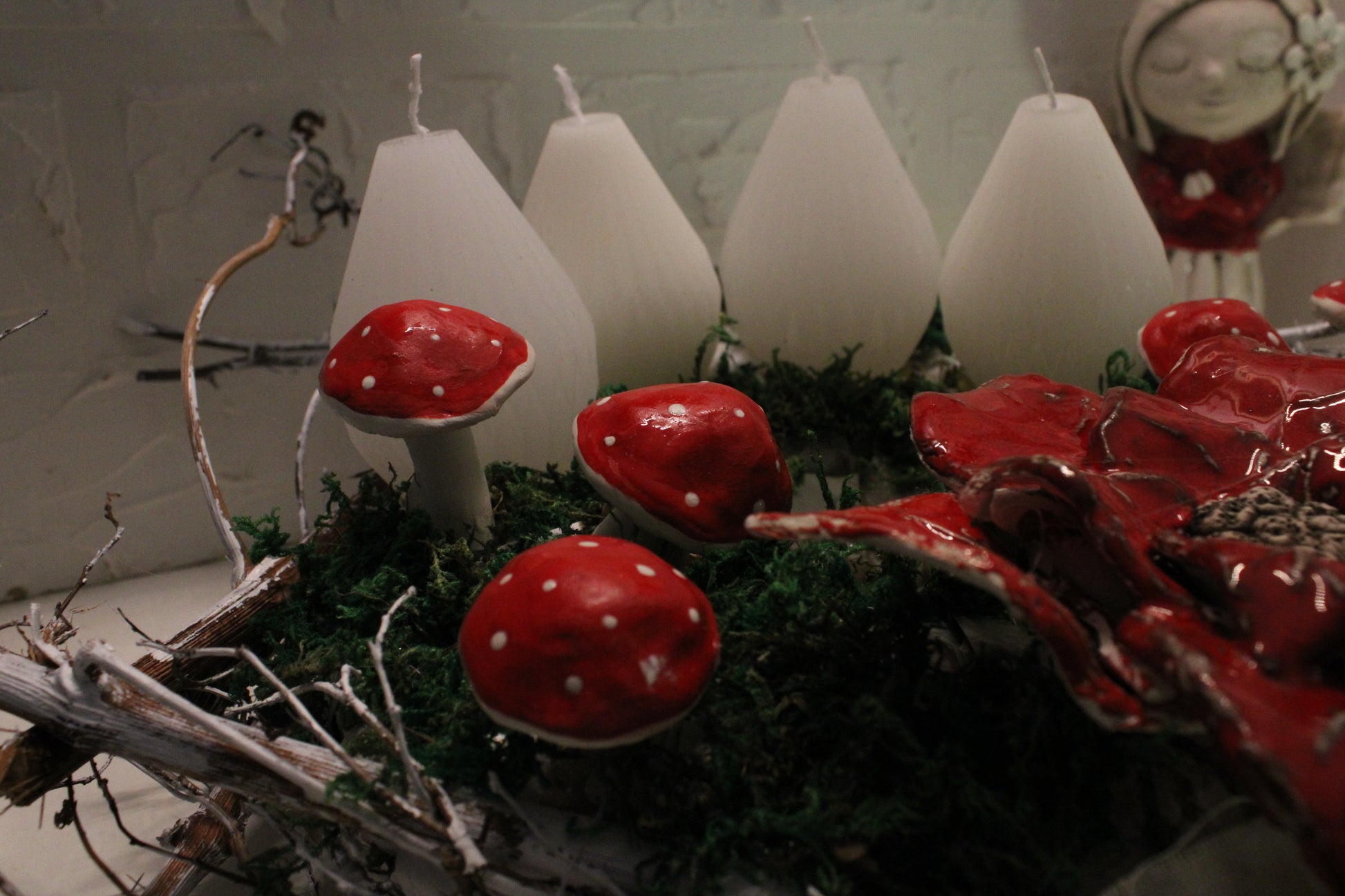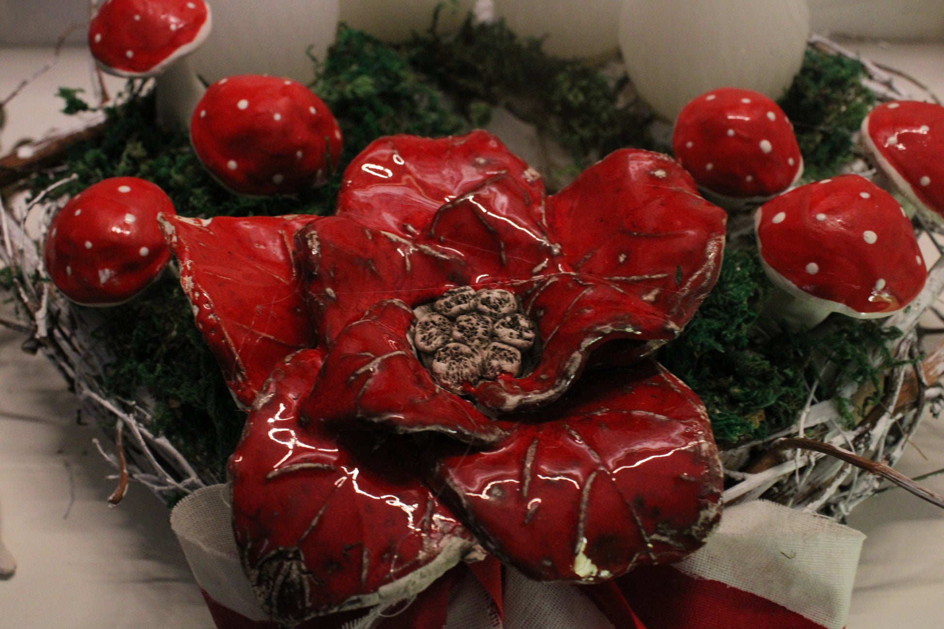 Ovaj razigrani adventski vjenčić kombinira prirodnu mahovinu s ručno modeliranim keramičkim gljivicama i velikom keramičkom božićnom zvijezdom u intenzivno crvenoj glazuri.