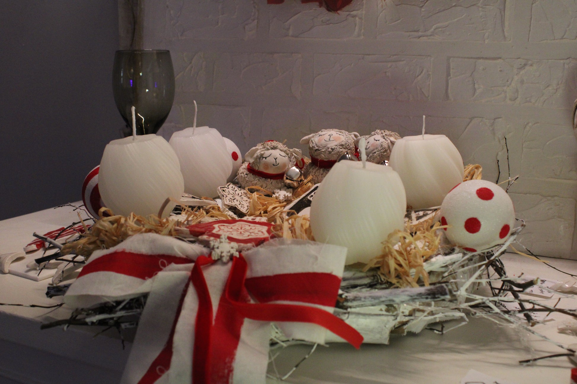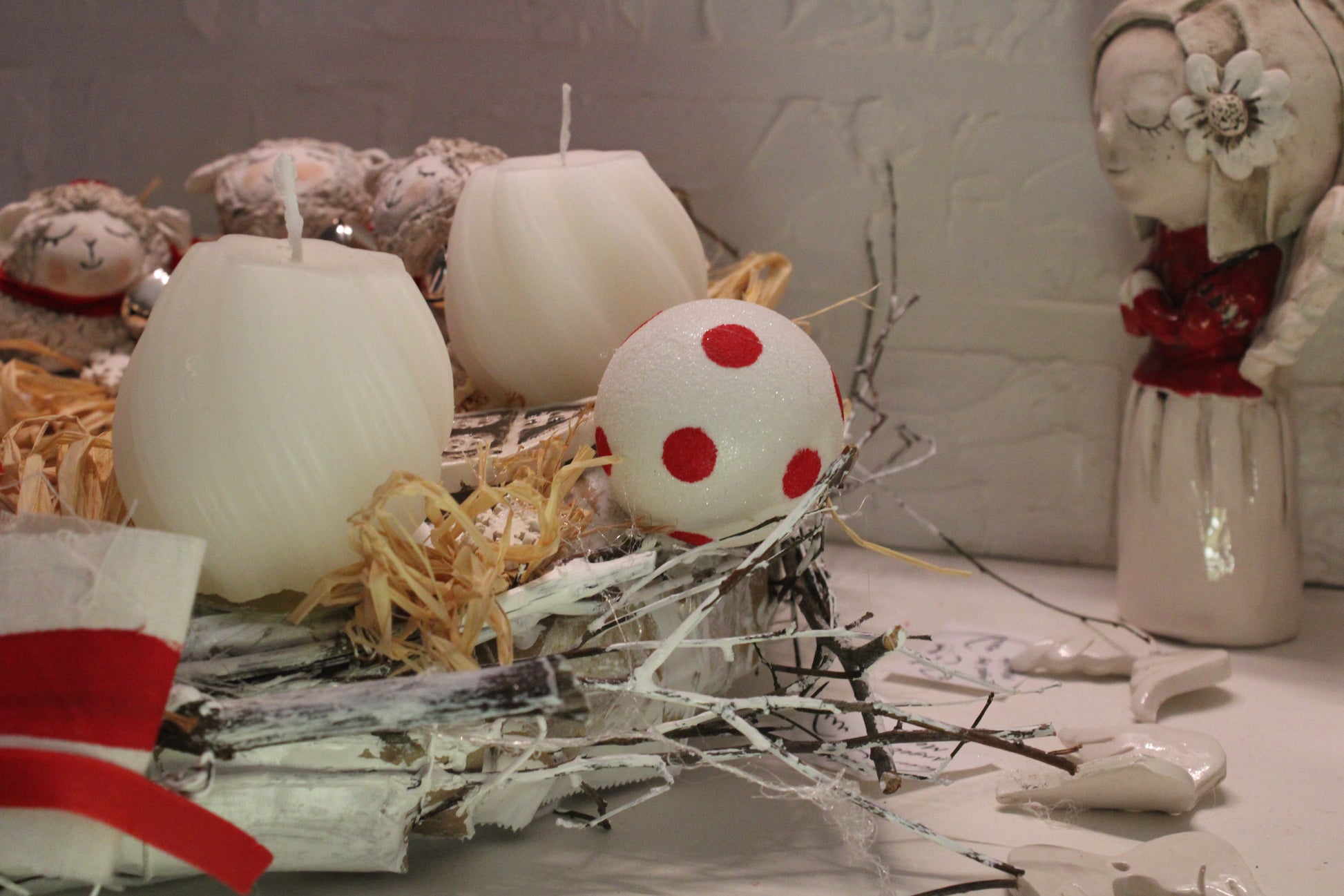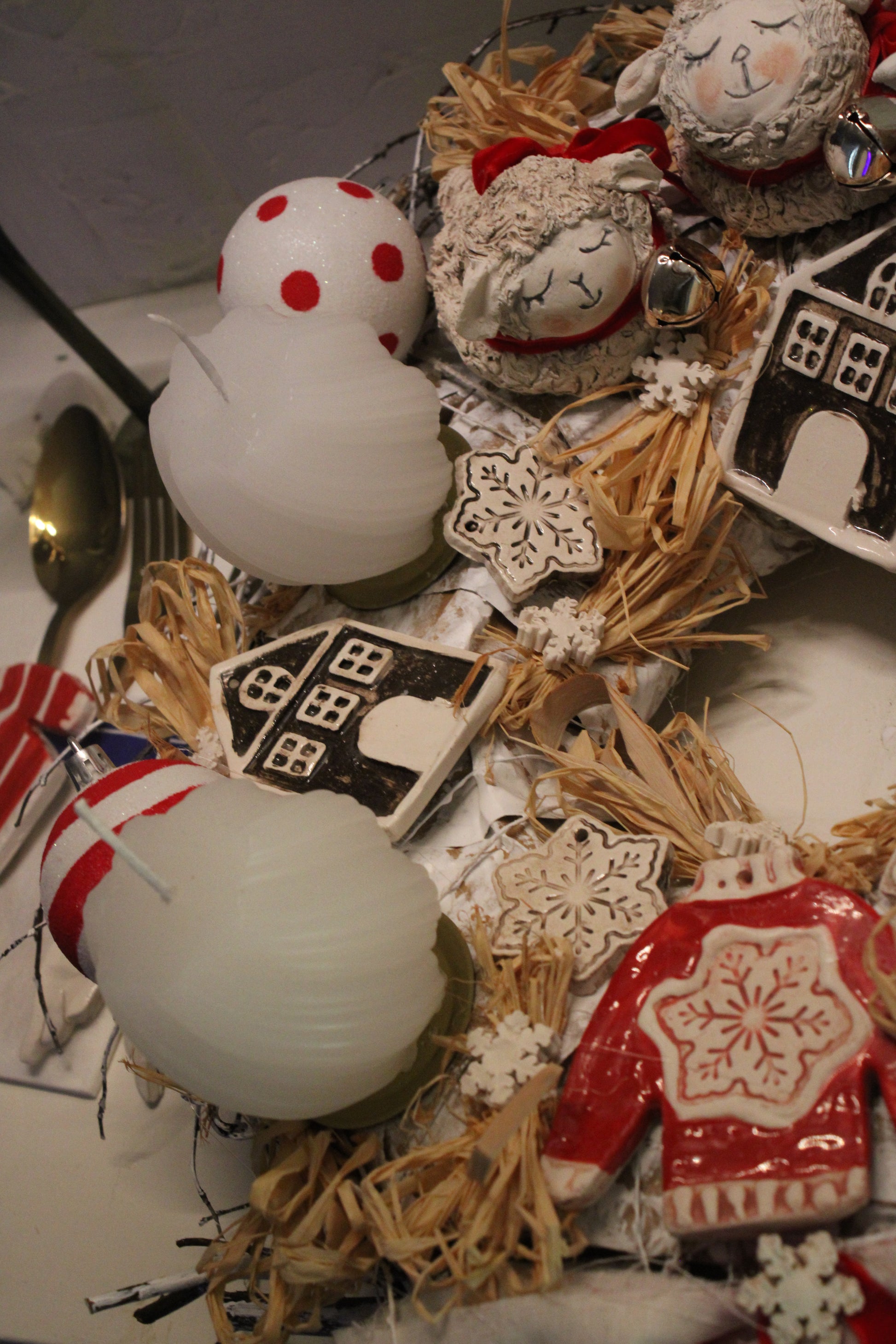 Materijal: keramika (bijela glina), engobe, prozirna glazura, ručno oslikane kuglice, četiri svijeće