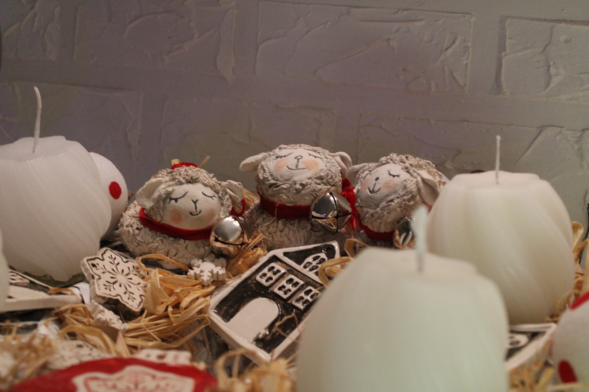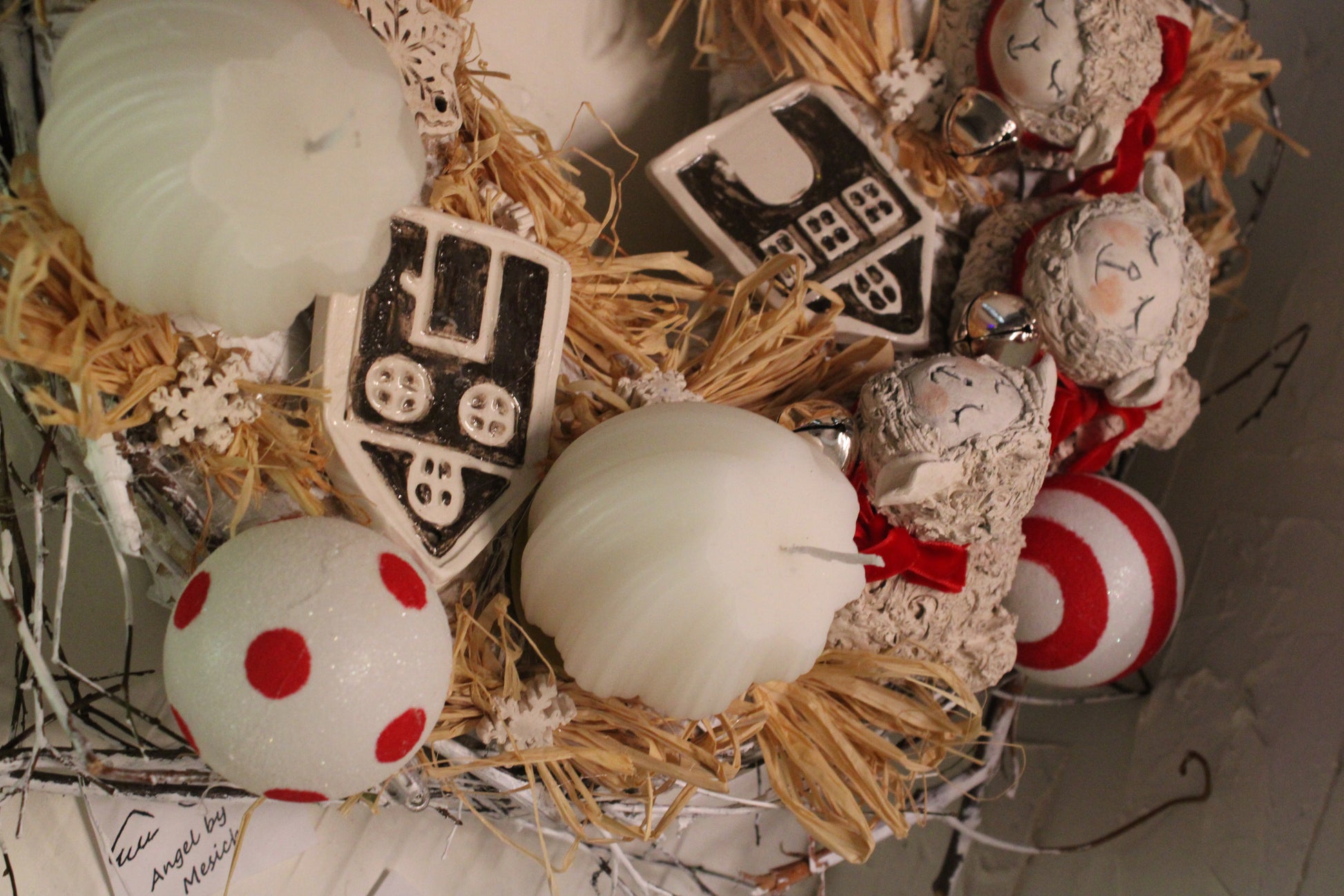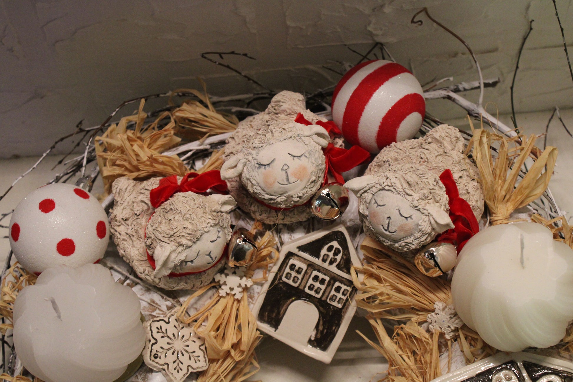 Ovaj veliki adventski vjenčić izrađen je ručno i ispunjen je nježnom zimskom atmosferom. Središnji motiv čine tri ručno modelirane keramičke ovčice, svaka s različitim izrazom lica i crvenim trakicama sa zvončićima.