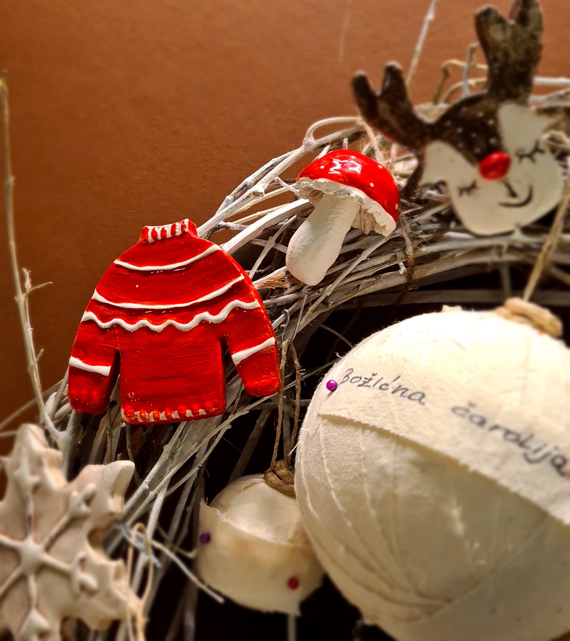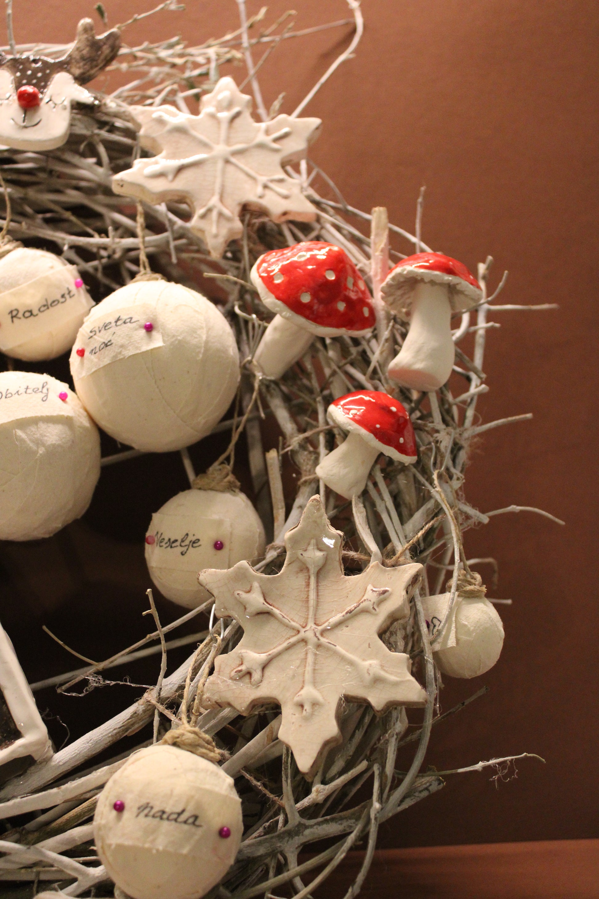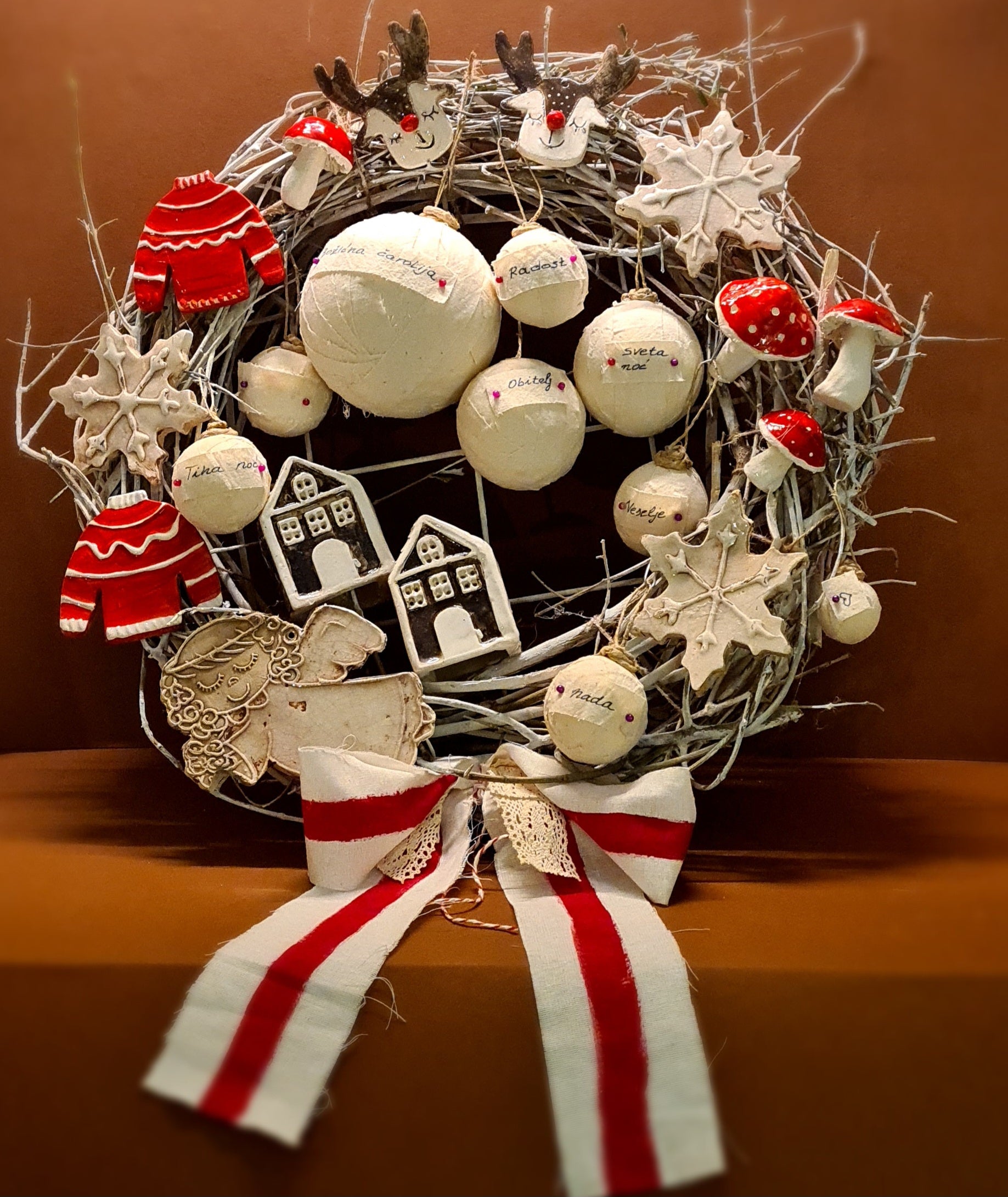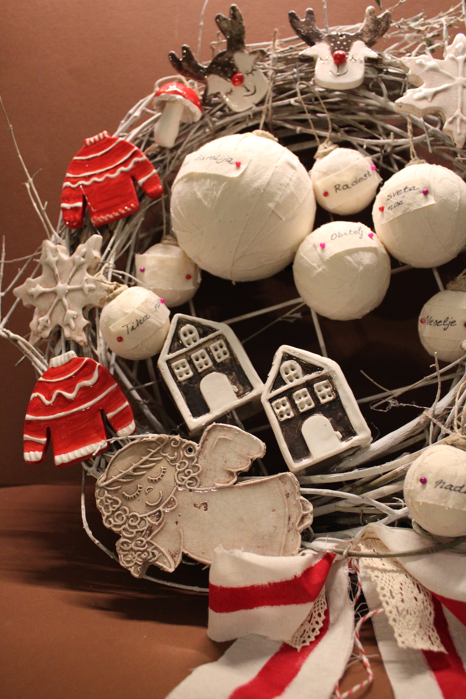 Ovaj bogato izrađeni blagdanski vjenčić sastavljen je od ručno modeliranih keramičkih elemenata i ručno ukrašavanih kuglica, što ga čini u potpunosti unikatnim umjetničkim komadom.