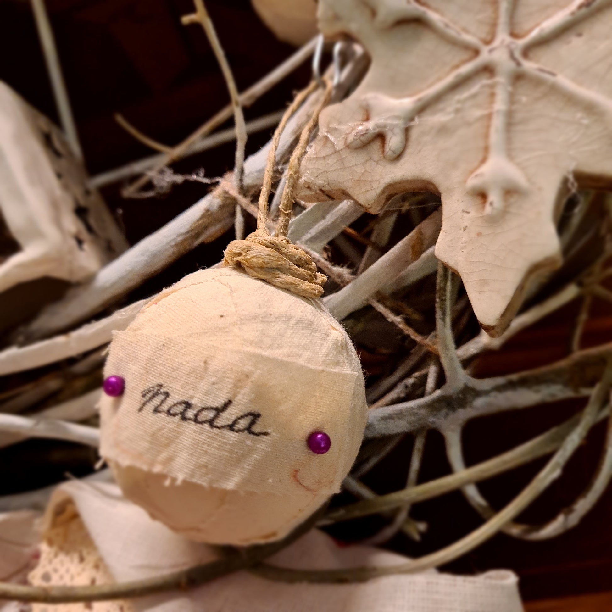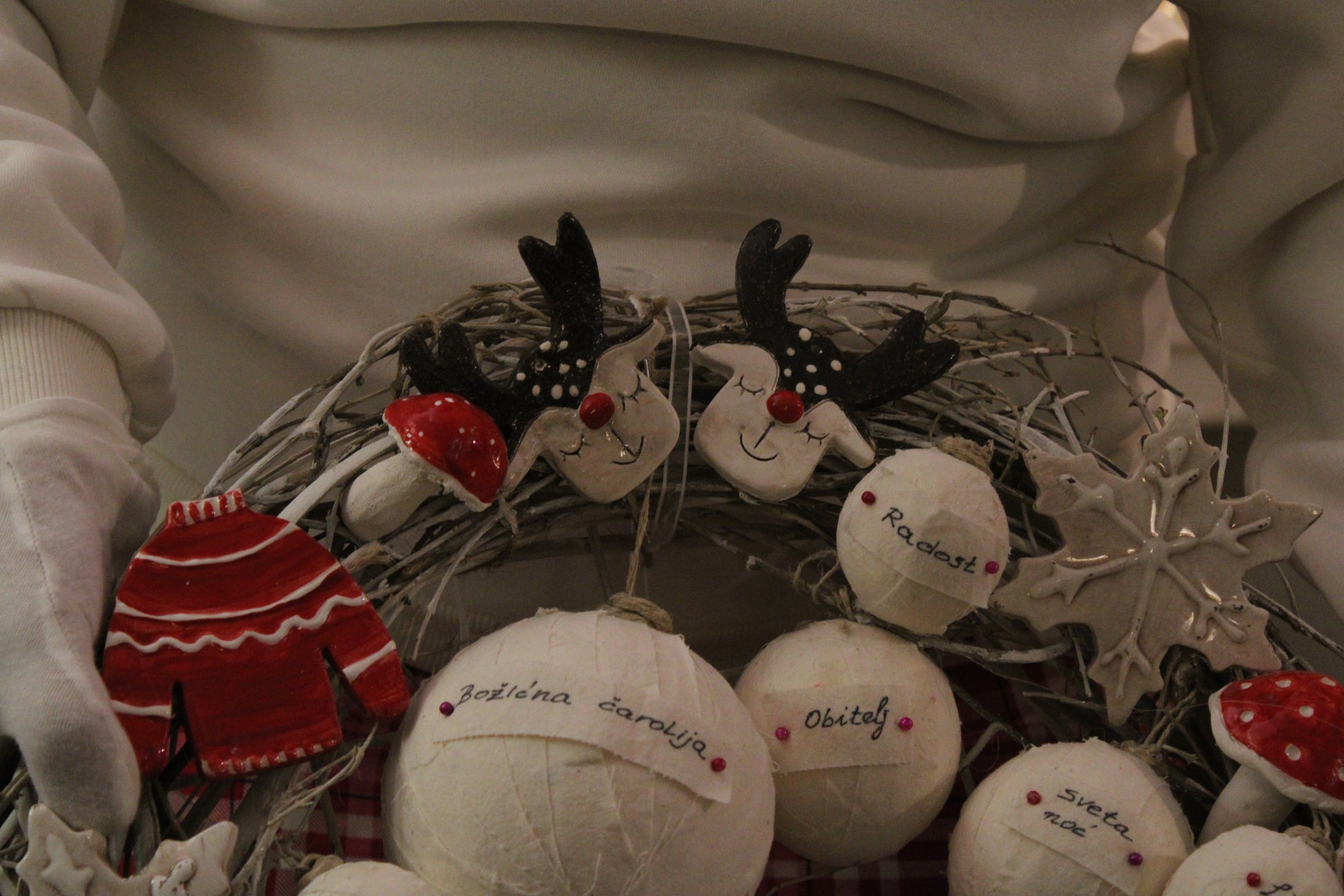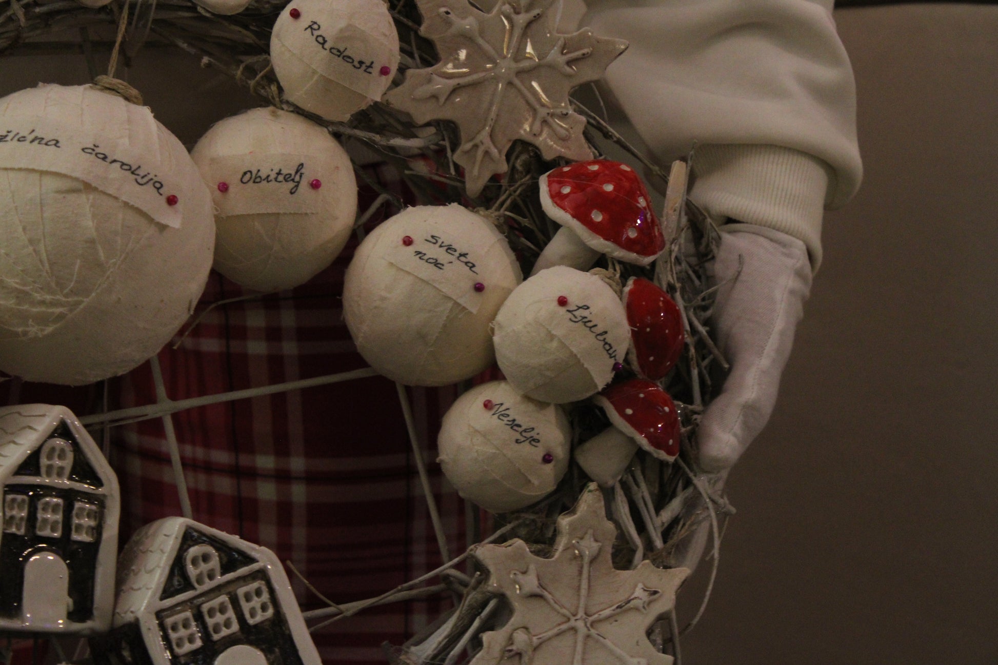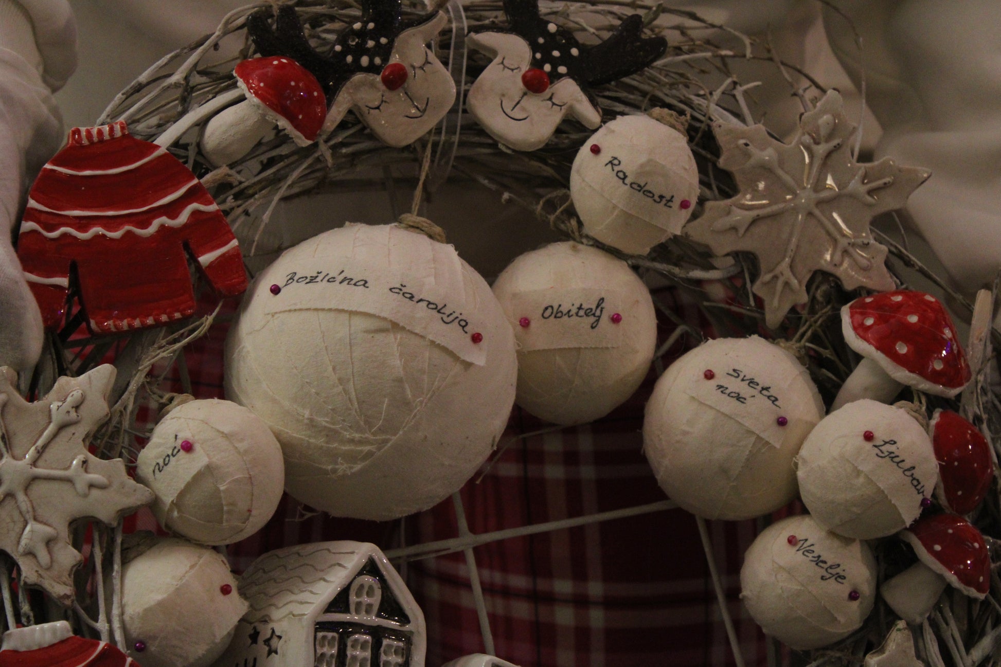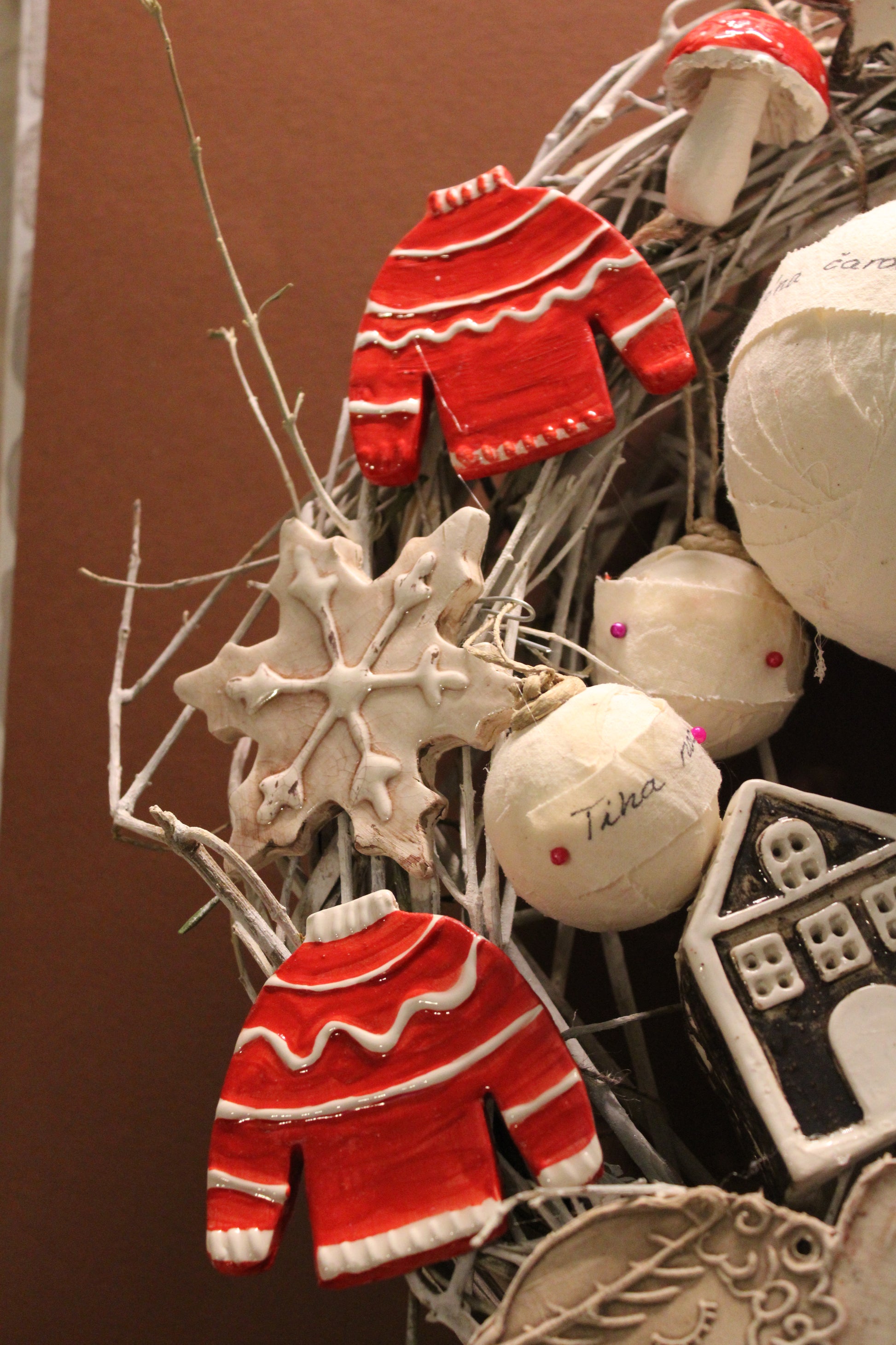 Ovaj bogato izrađeni blagdanski vjenčić sastavljen je od ručno modeliranih keramičkih elemenata i ručno ukrašavanih kuglica, što ga čini u potpunosti unikatnim umjetničkim komadom.