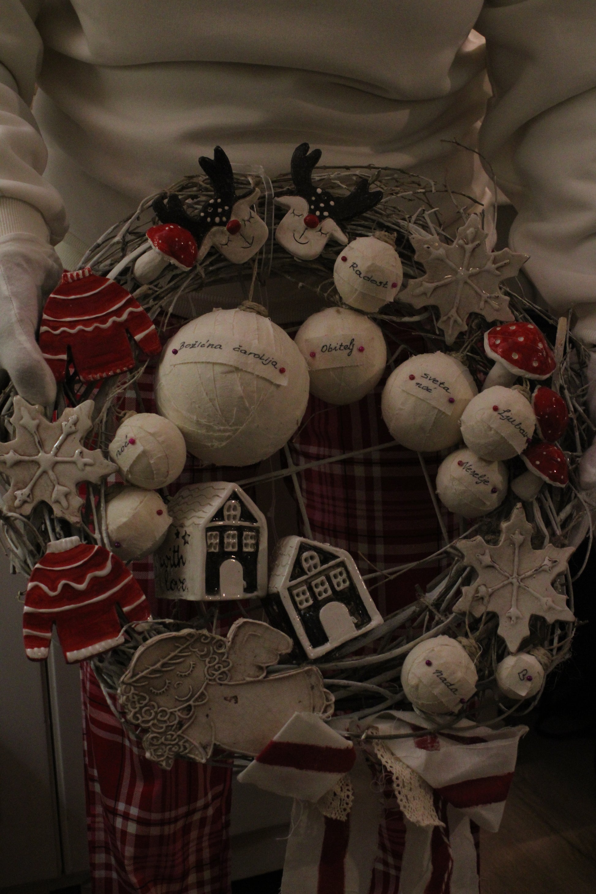 Ovaj vjenčić je bogat, razigran i pun malih blagdanskih detalja — idealan za ulazna vrata ili interijer, kao trajna i topla božićna dekoracija iz koje se vidi sav trud i ljubav ručnog rada.