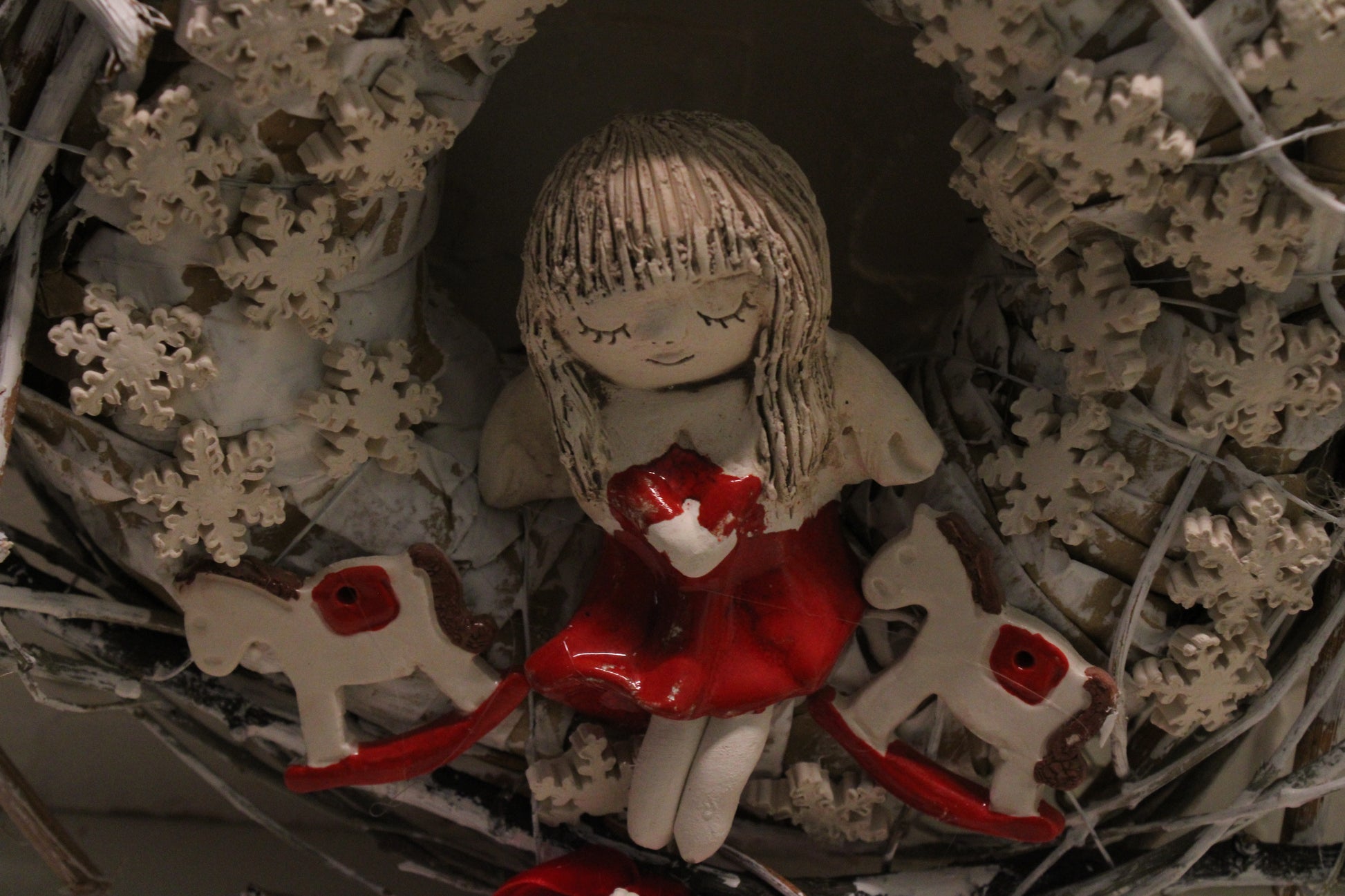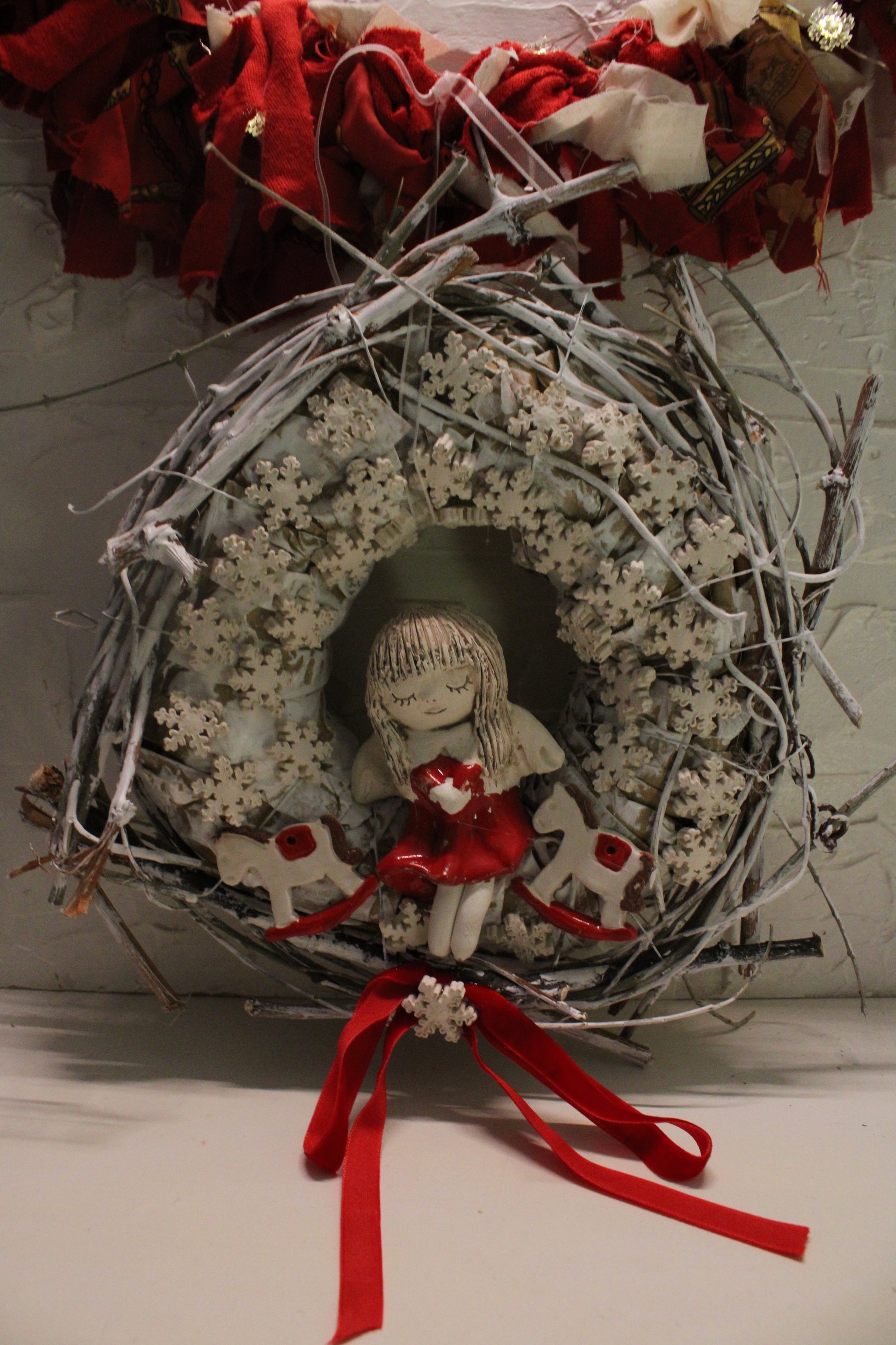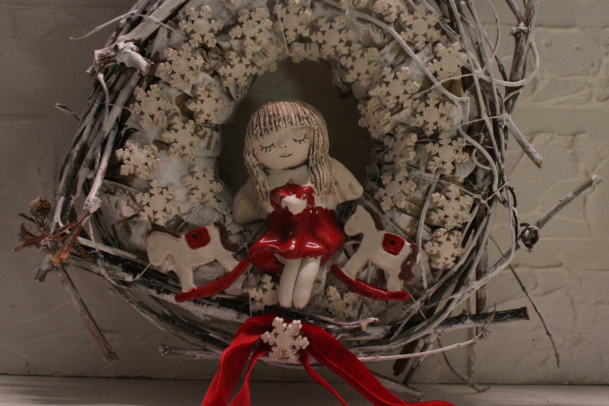 Ovaj nježni keramički vjenčić izrađen je ručno i ukrašen desecima sitnih keramičkih pahuljica koje stvaraju dojam snježnog okvira. U središtu se nalazi čaroban keramički anđelić u crvenoj haljinici, a s obje strane smješteni su slatki keramički konjići, također ručno modelirani i glazirani.