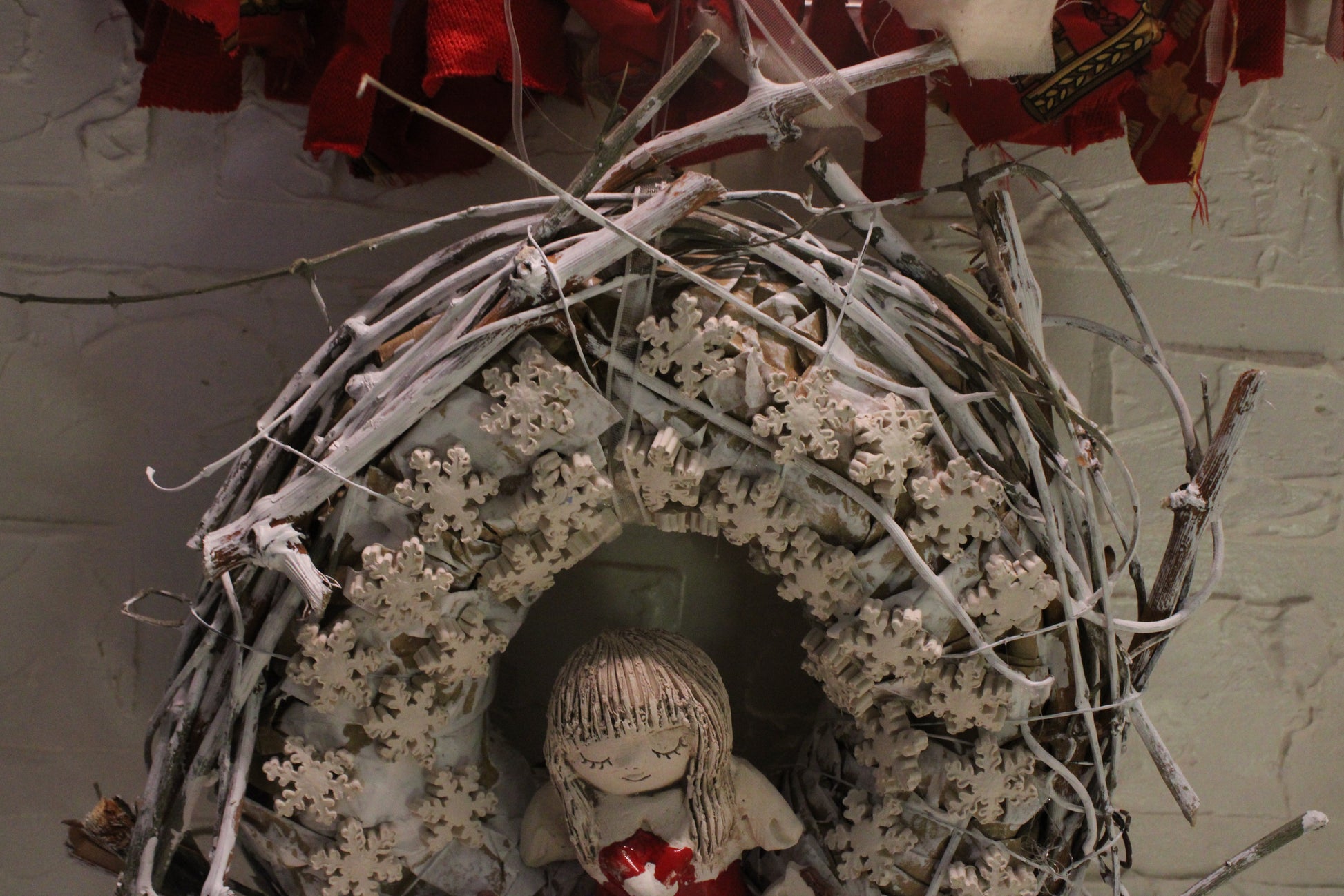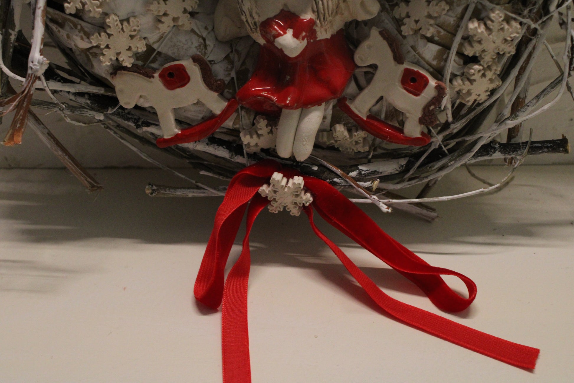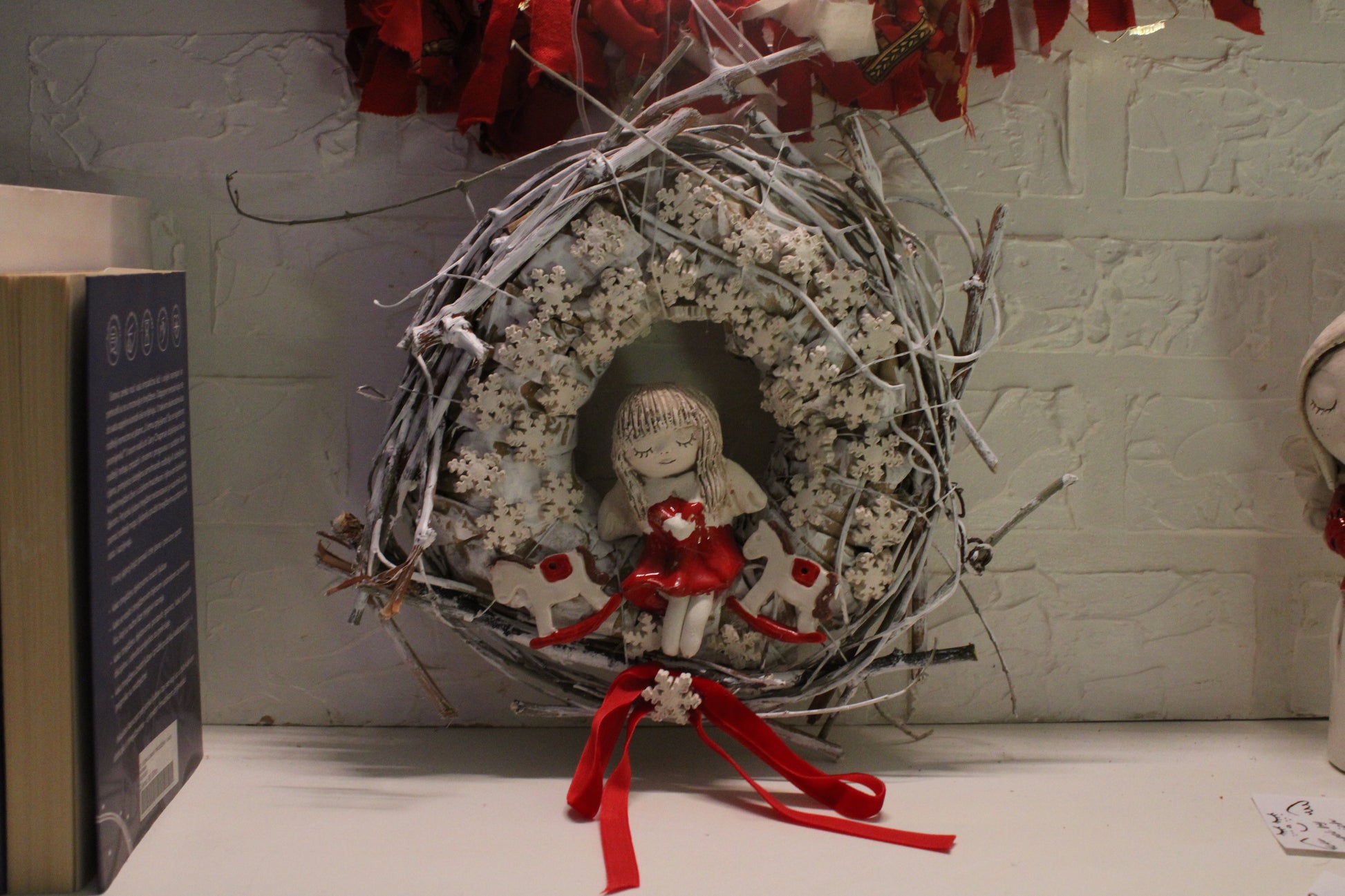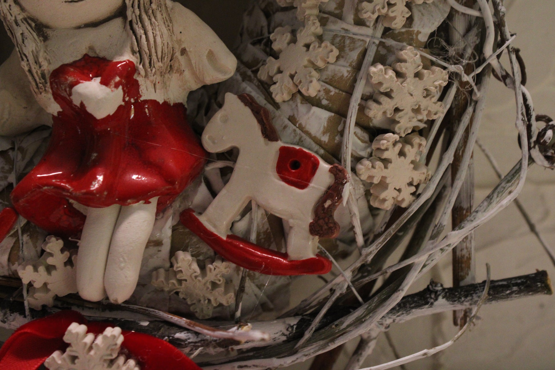 Ovaj nježni keramički vjenčić izrađen je ručno i ukrašen desecima sitnih keramičkih pahuljica koje stvaraju dojam snježnog okvira. U središtu se nalazi čaroban keramički anđelić u crvenoj haljinici, a s obje strane smješteni su slatki keramički konjići, također ručno modelirani i glazirani.