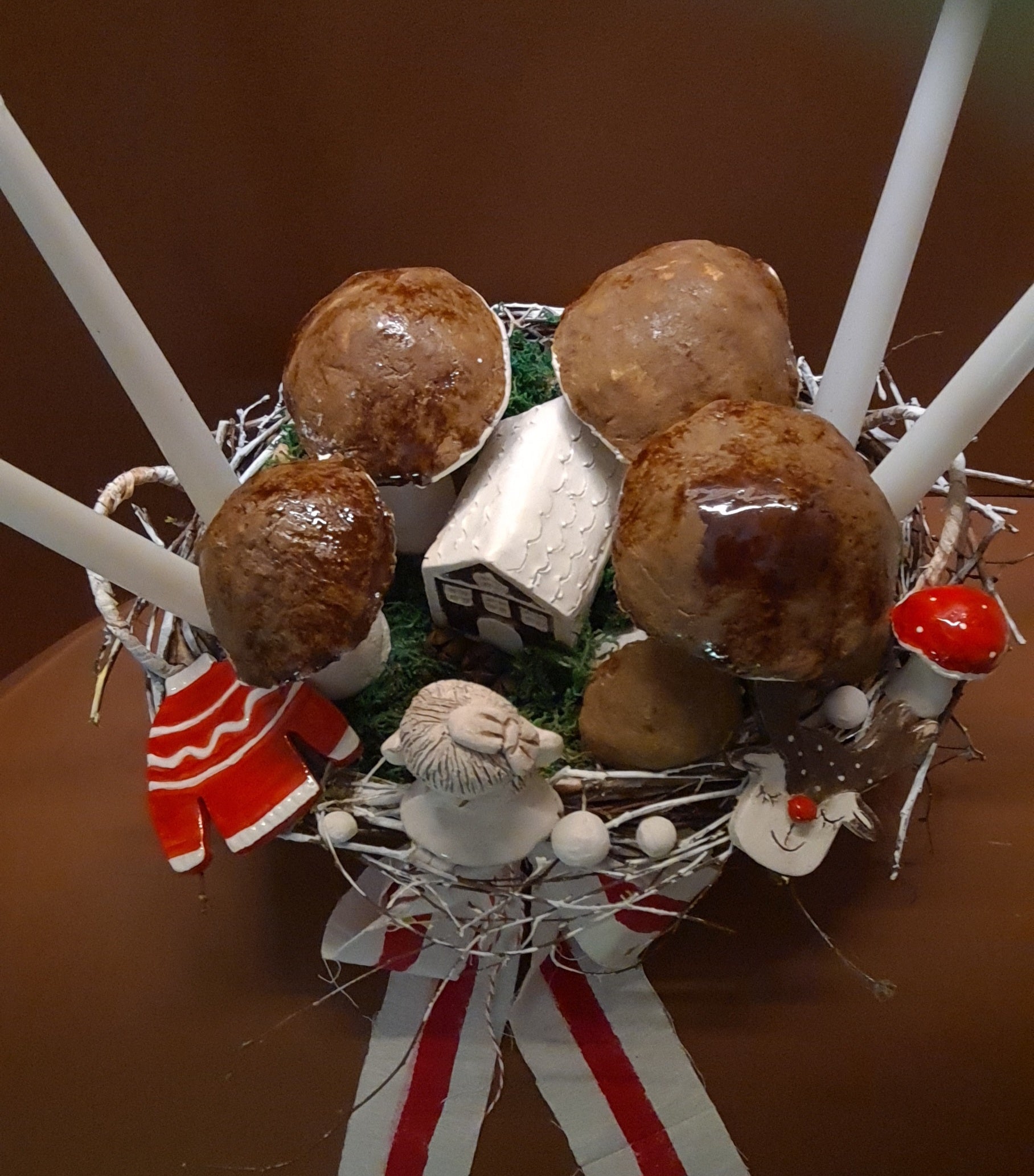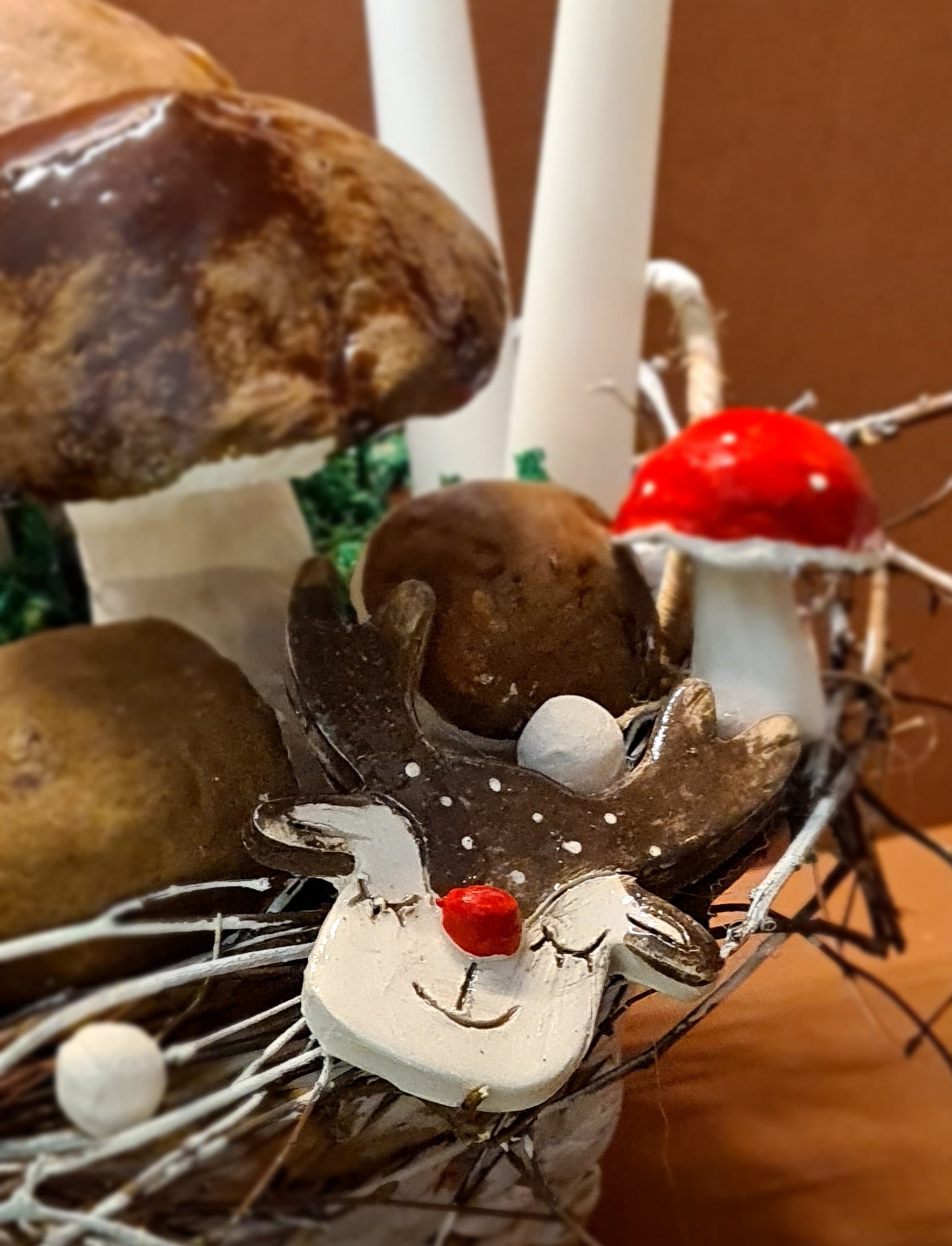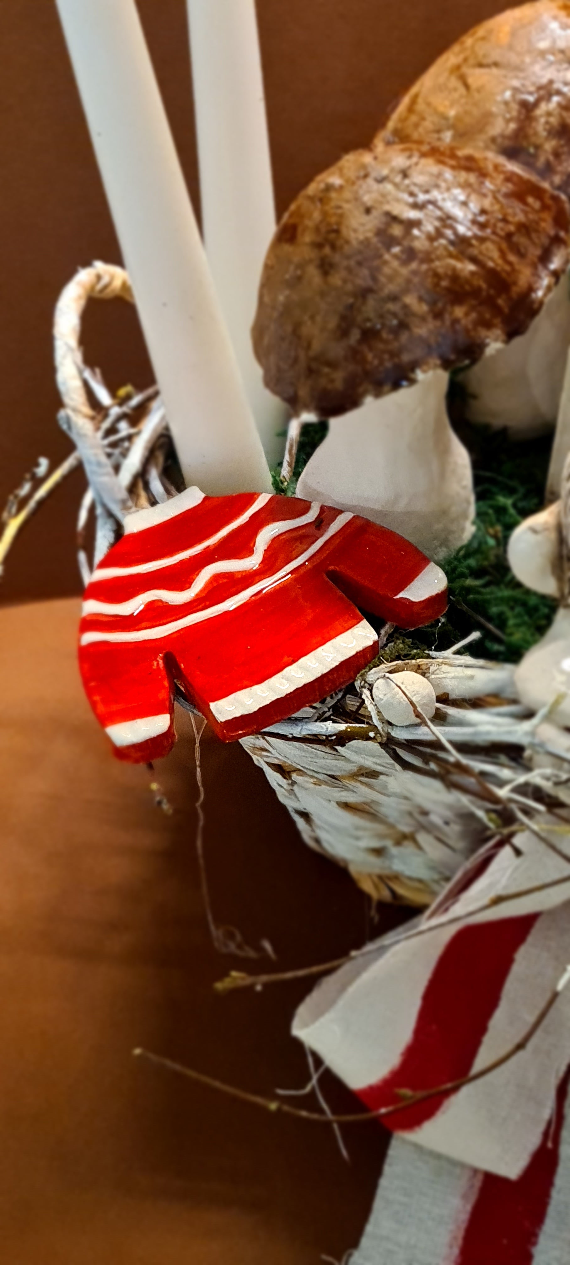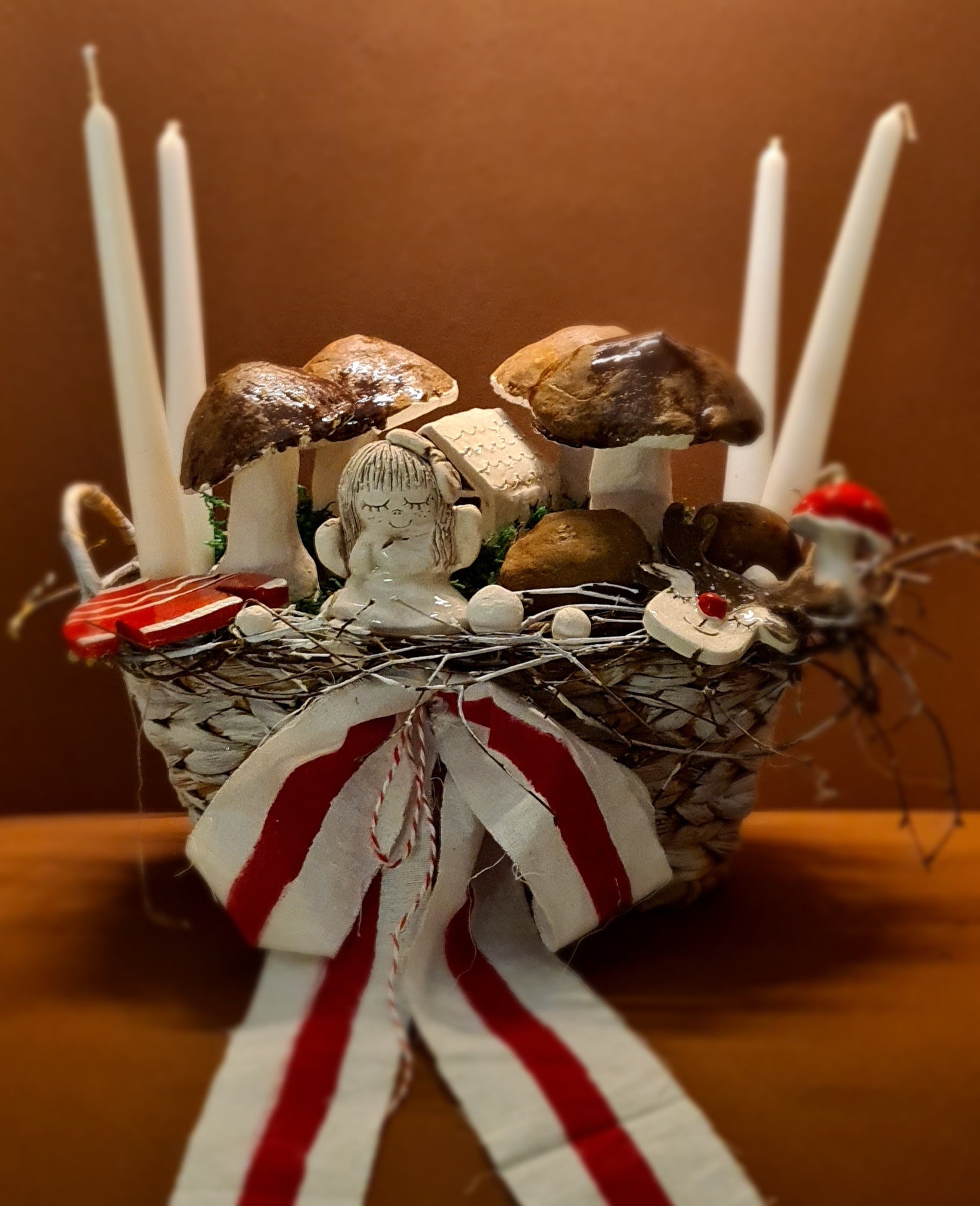 U središtu se nalazi mali keramički anđelić, okružen dekorativnim gljivama i blagdanskim detaljima. Aranžman ima mjesta za četiri svijeće, koje mogu biti crvene ili bijele prema želji kupca.