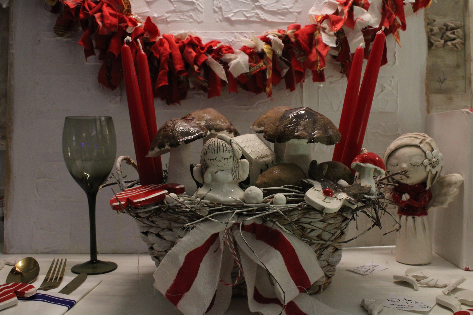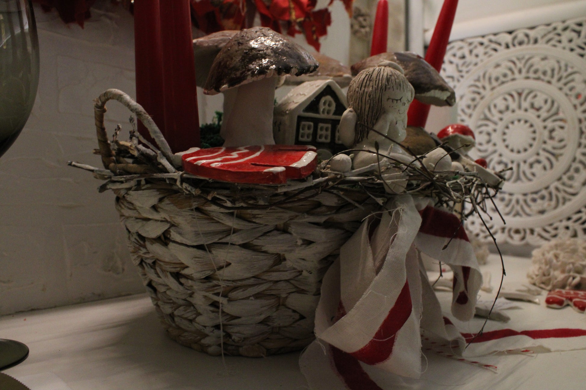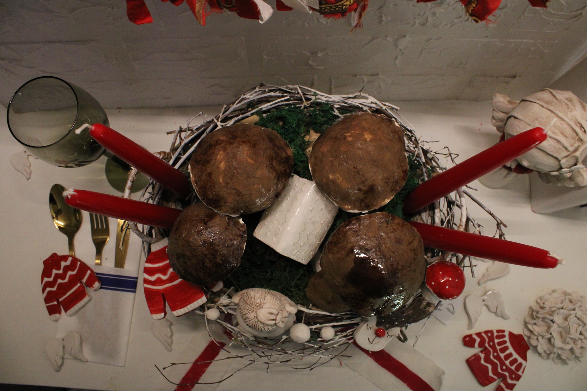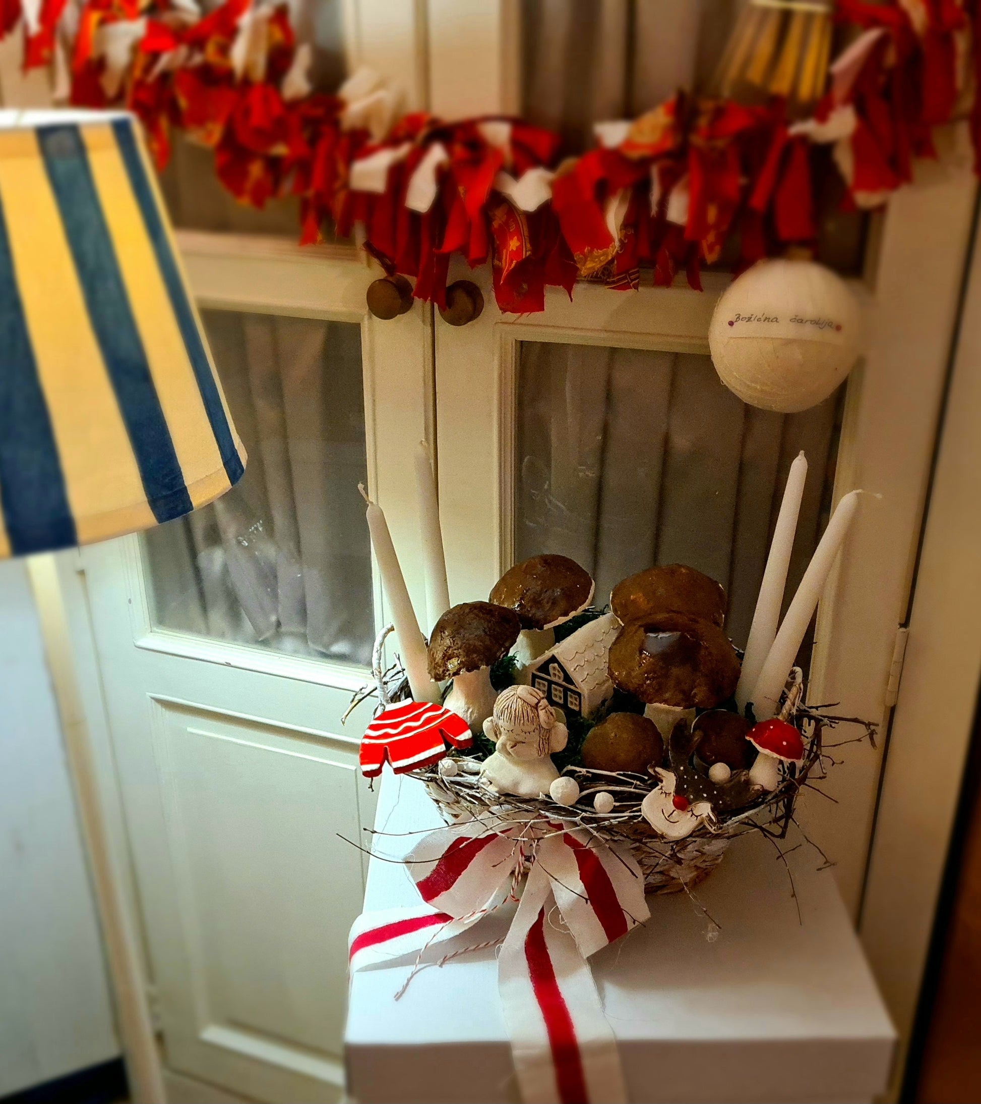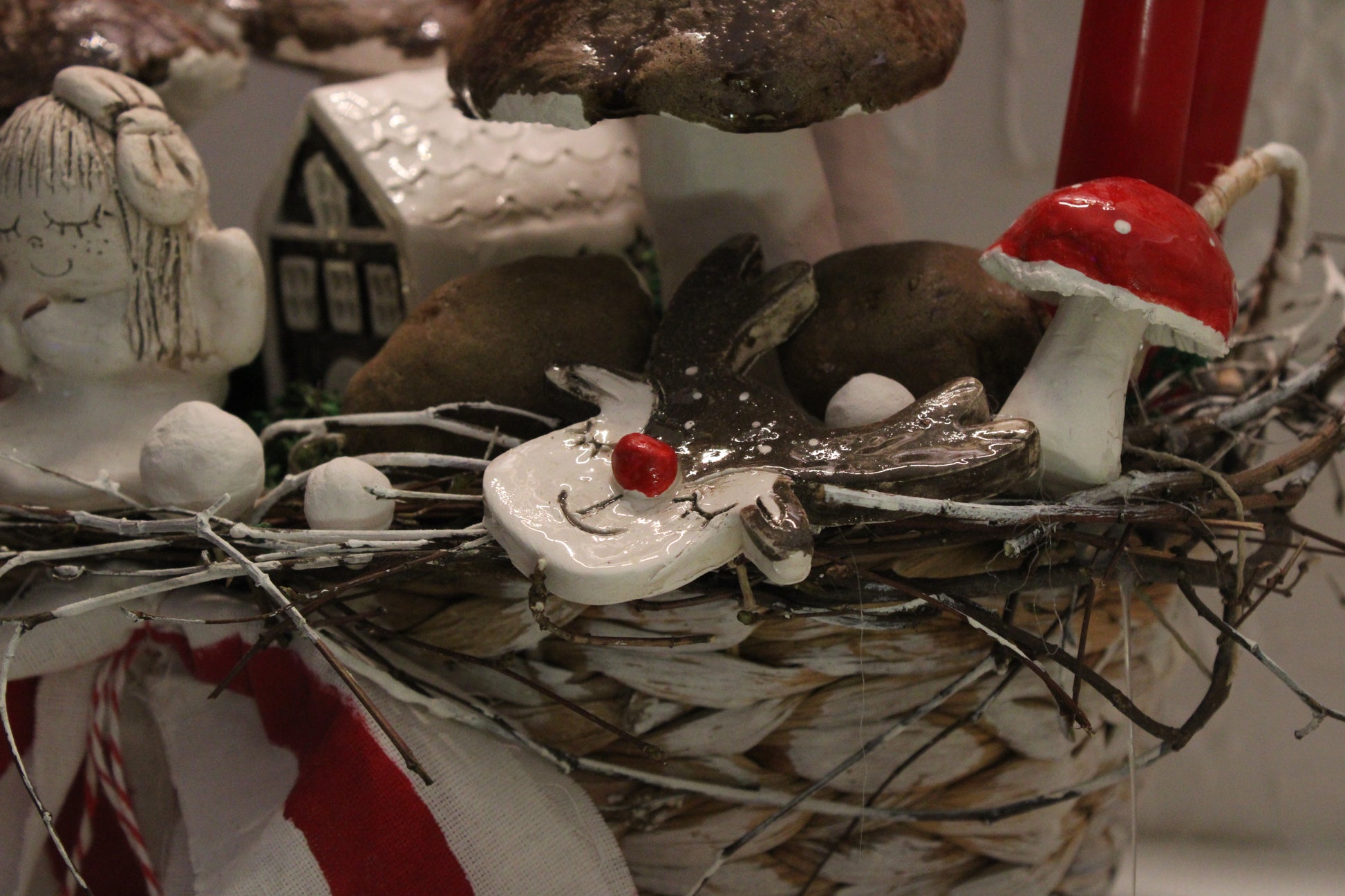 U središtu se nalazi mali keramički anđelić, okružen dekorativnim gljivama i blagdanskim detaljima. Aranžman ima mjesta za četiri svijeće, koje mogu biti crvene ili bijele prema želji kupca.