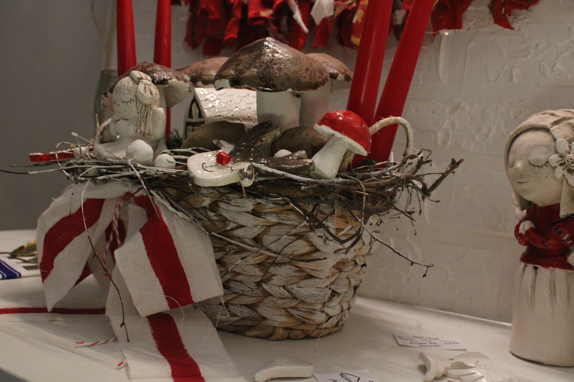 Materijal: keramika (bijela glina, engobe, prozirna glazura), prirodni glijevi, dekorativne vrpce