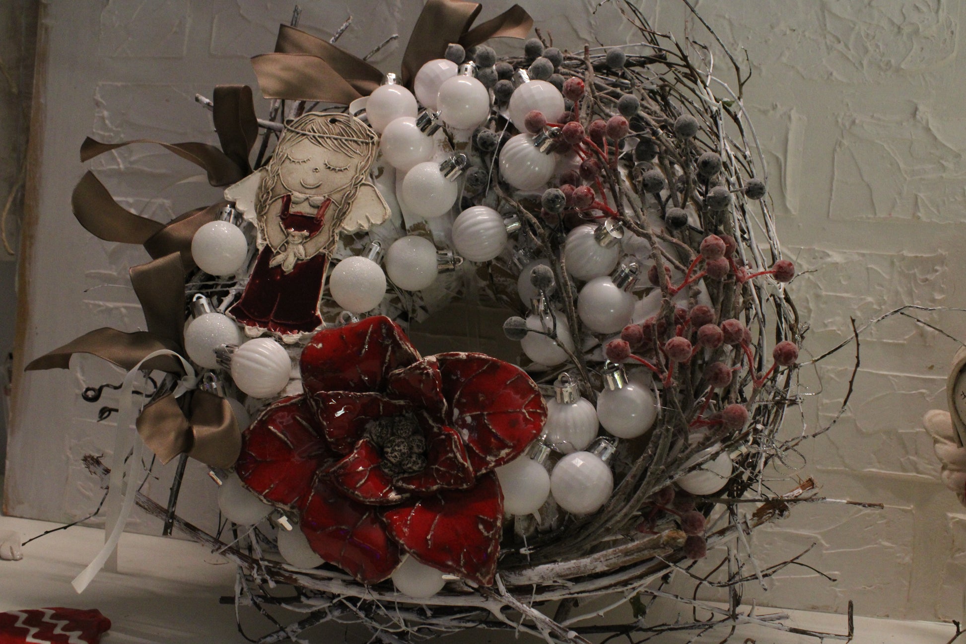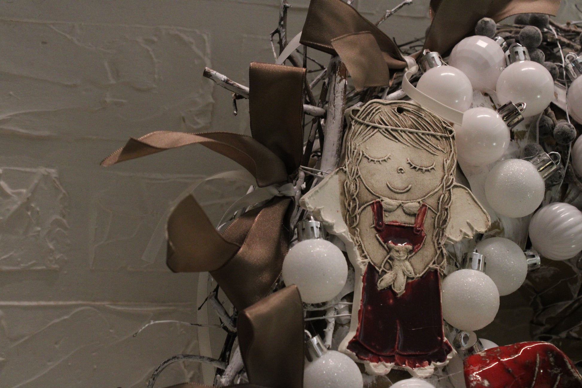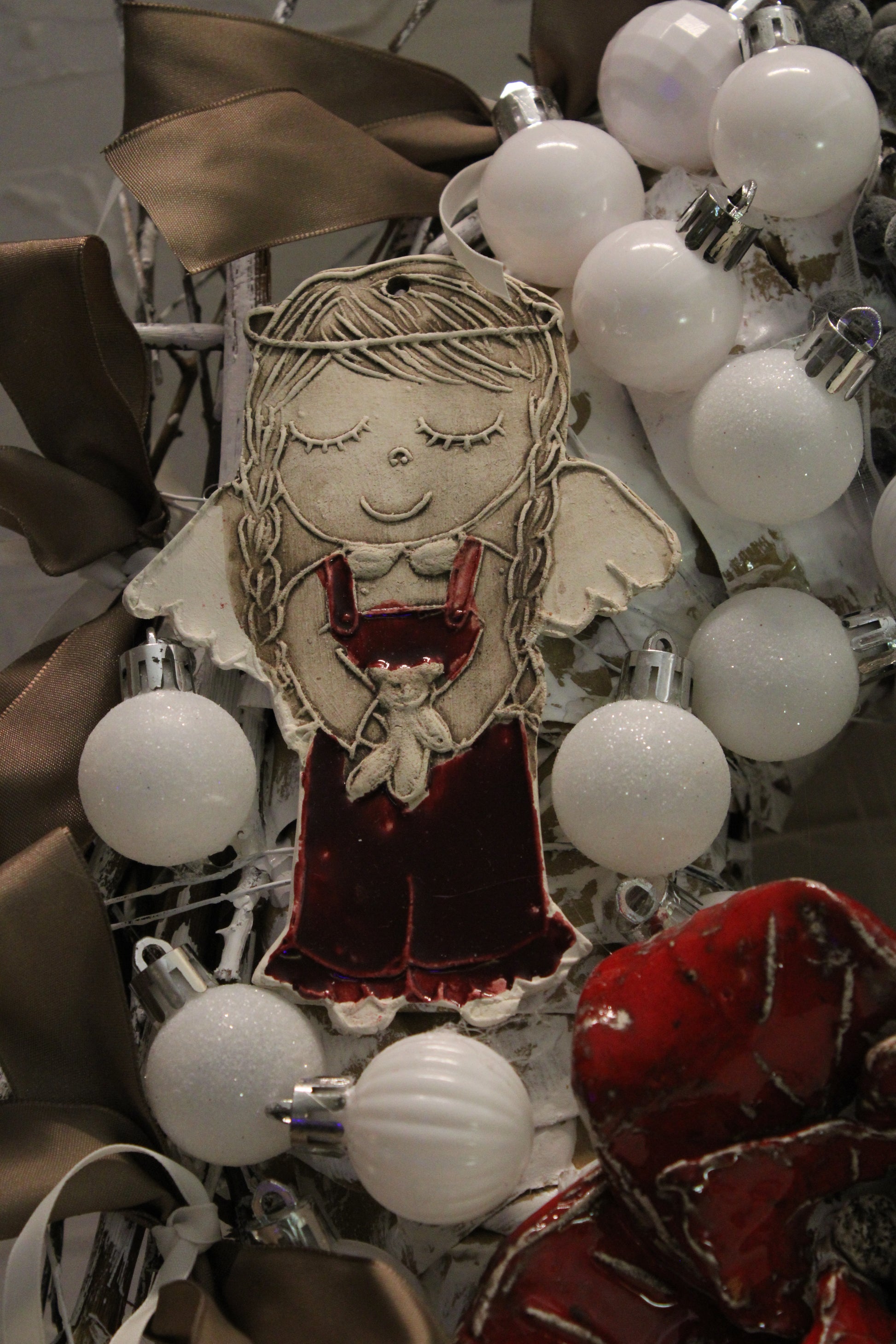 U gornjem dijelu nalazi se keramički anđeo ručnog rada, oslikan finim engobama i glazurom, dok donji dio krasi velika keramička božićna zvijezda u intenzivnoj crvenoj boji.