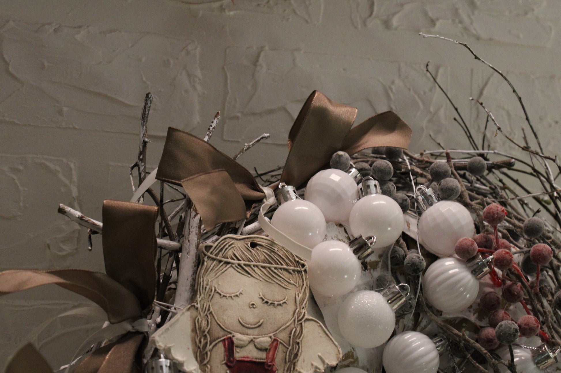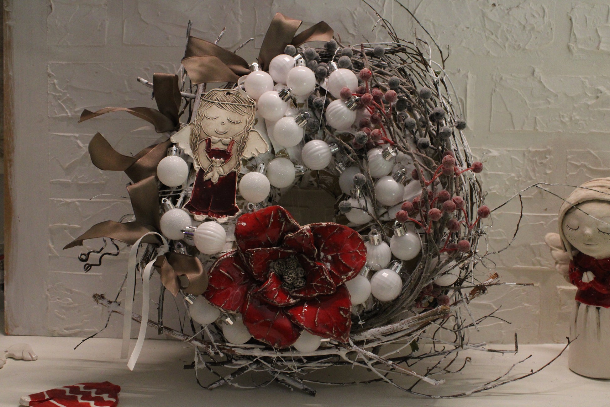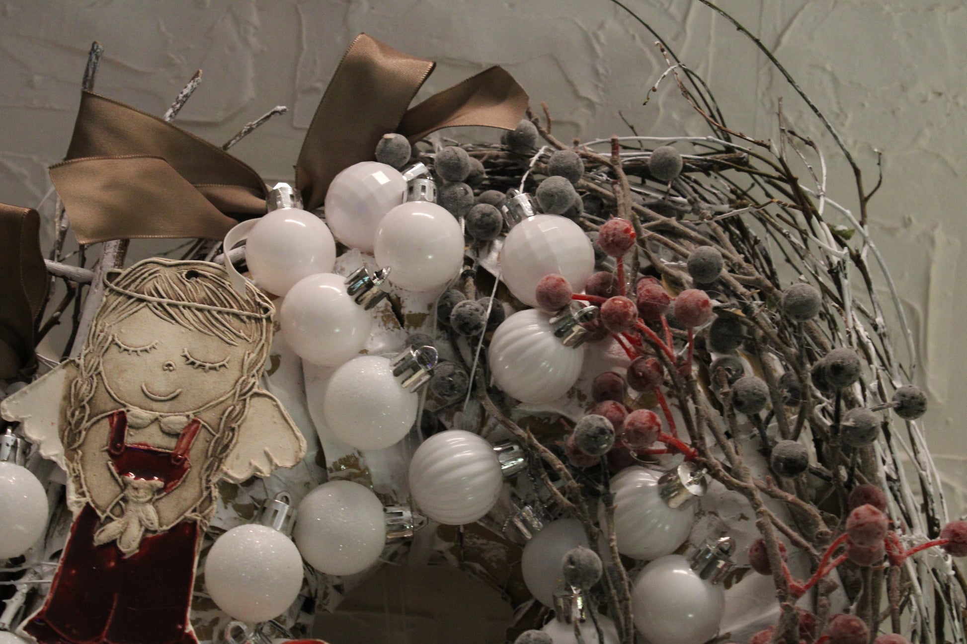 U gornjem dijelu nalazi se keramički anđeo ručnog rada, oslikan finim engobama i glazurom, dok donji dio krasi velika keramička božićna zvijezda u intenzivnoj crvenoj boji.