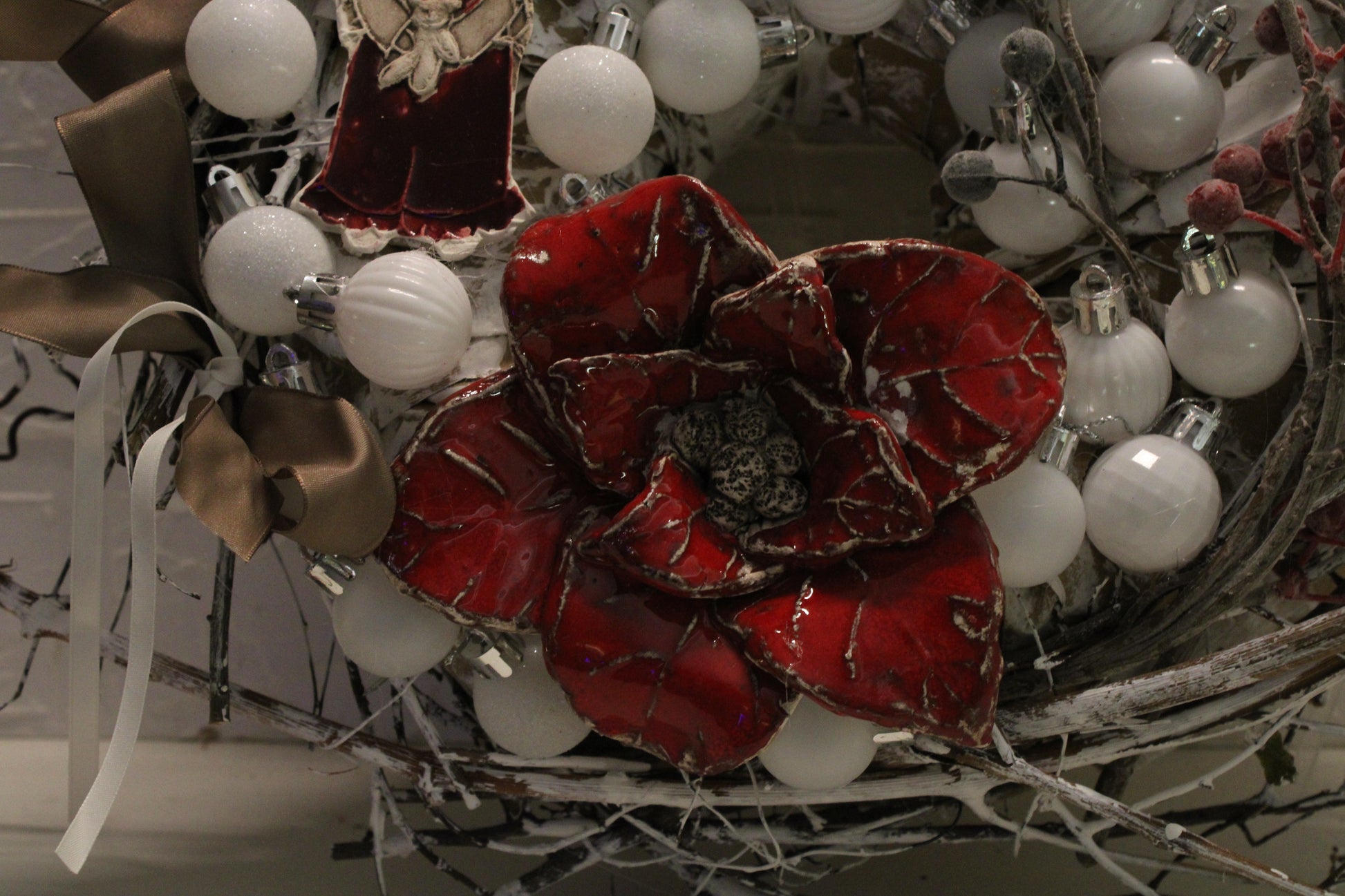 Ovaj unikatan zidni vjenčić izrađen je od ručno modelirane keramike, kombinirajući bijelu glinu, engobe i crvenu glazuru na velikoj keramičkoj božićnoj zvijezdi.