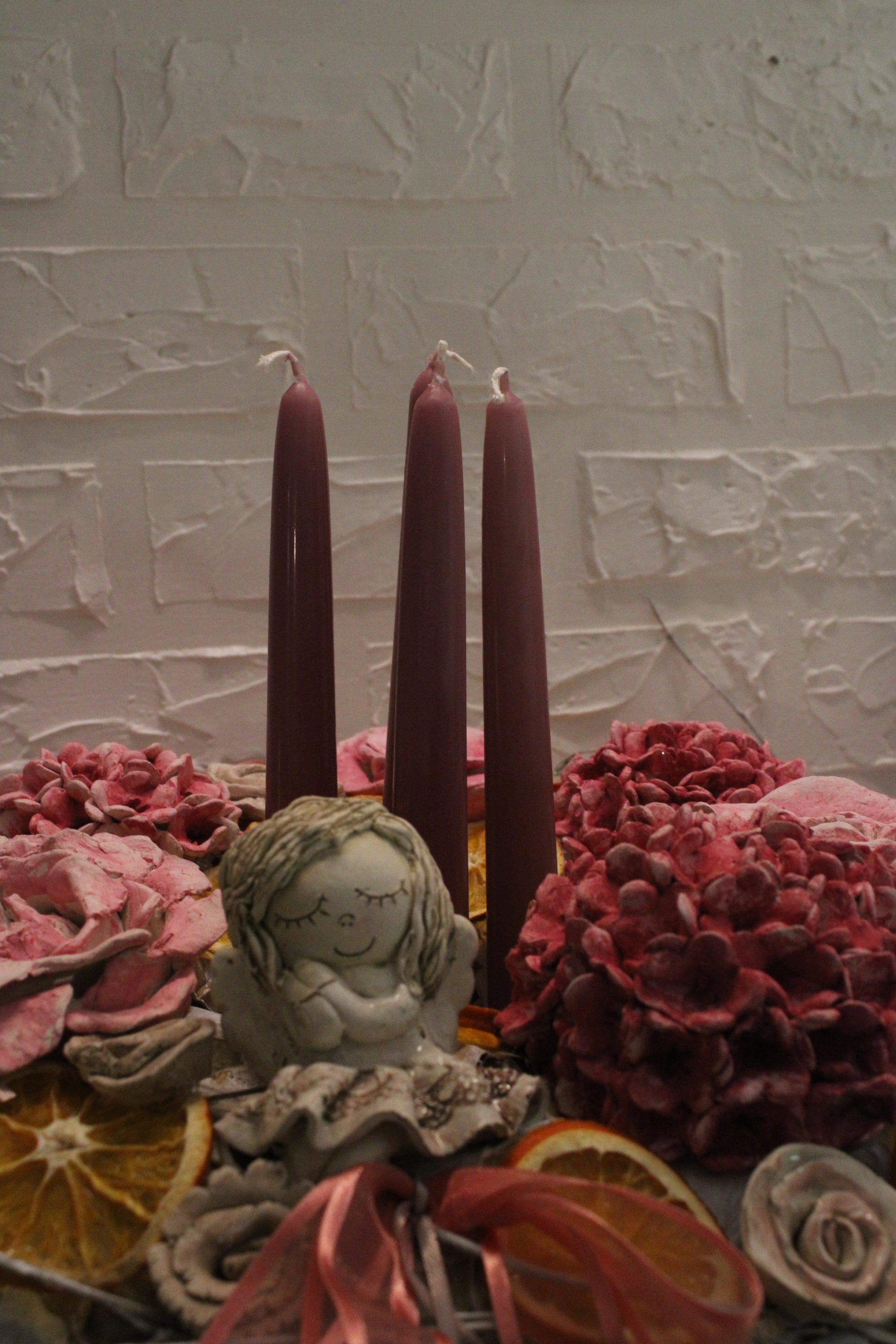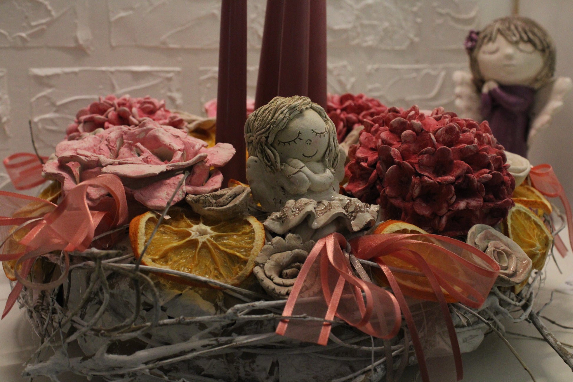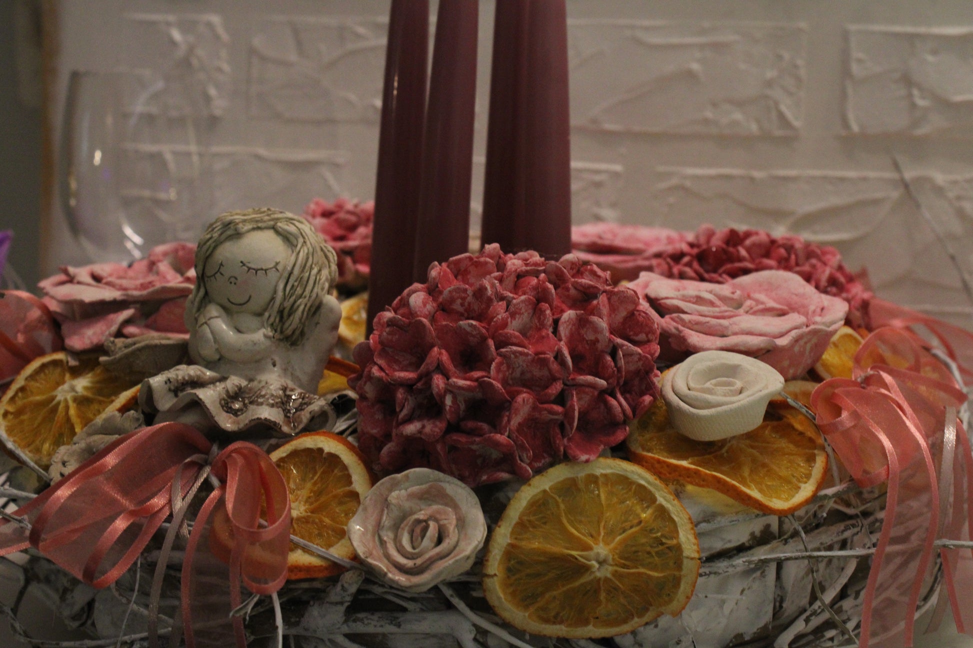 Ovaj romantični adventski vjenčić izrađen je od ručno modeliranih keramičkih elemenata: hortenzija, ružica i malog anđela u nježnim pastelnim tonovima. Keramika je obrađena engobama i zaštićena prozirnom glazurom, što daje trajnost i finoću svakom detalju.