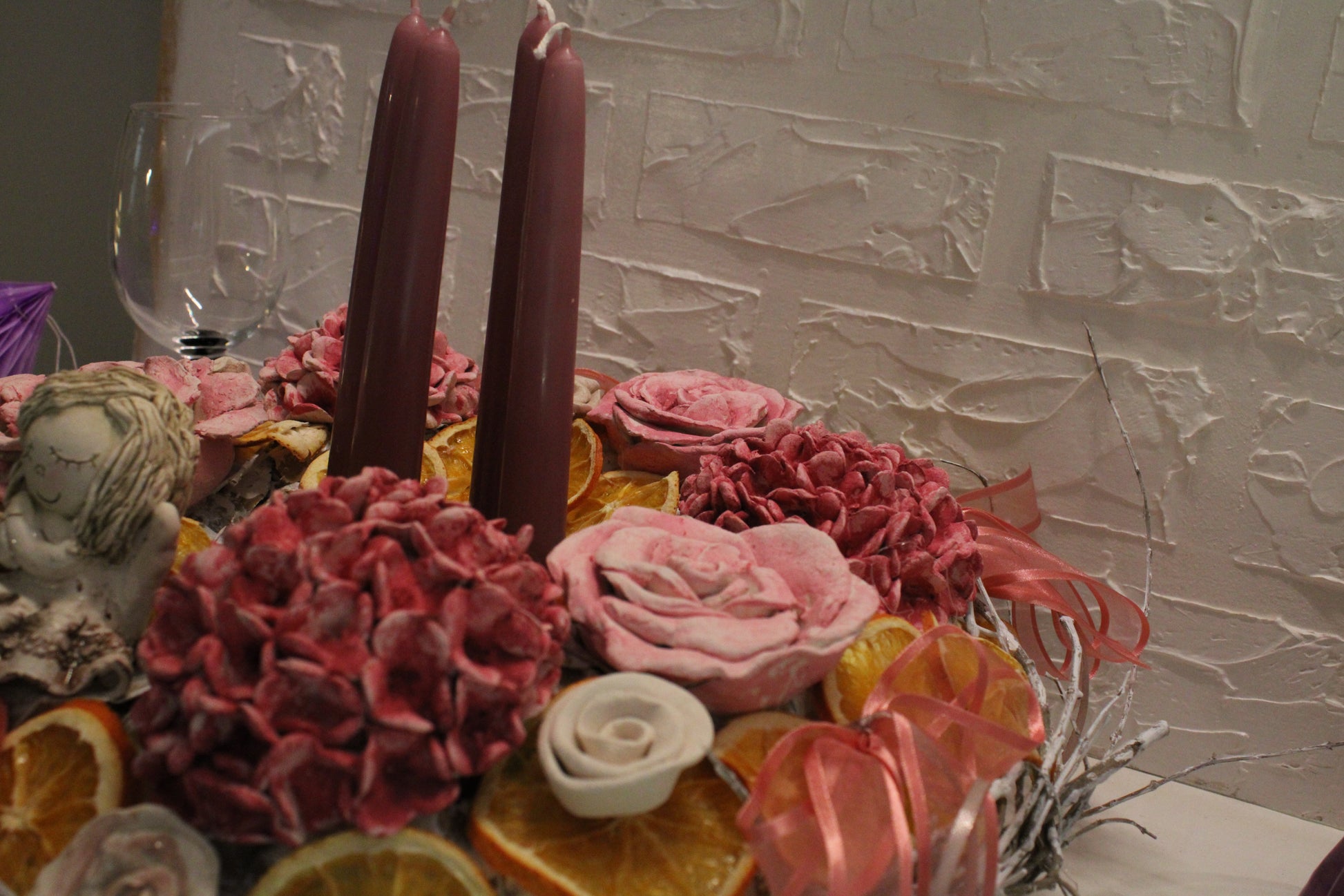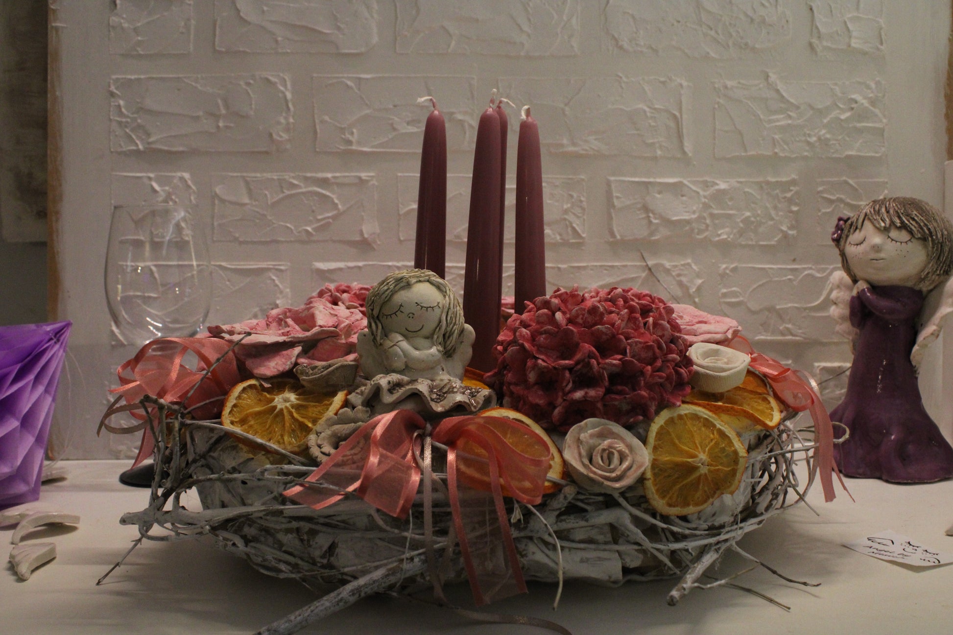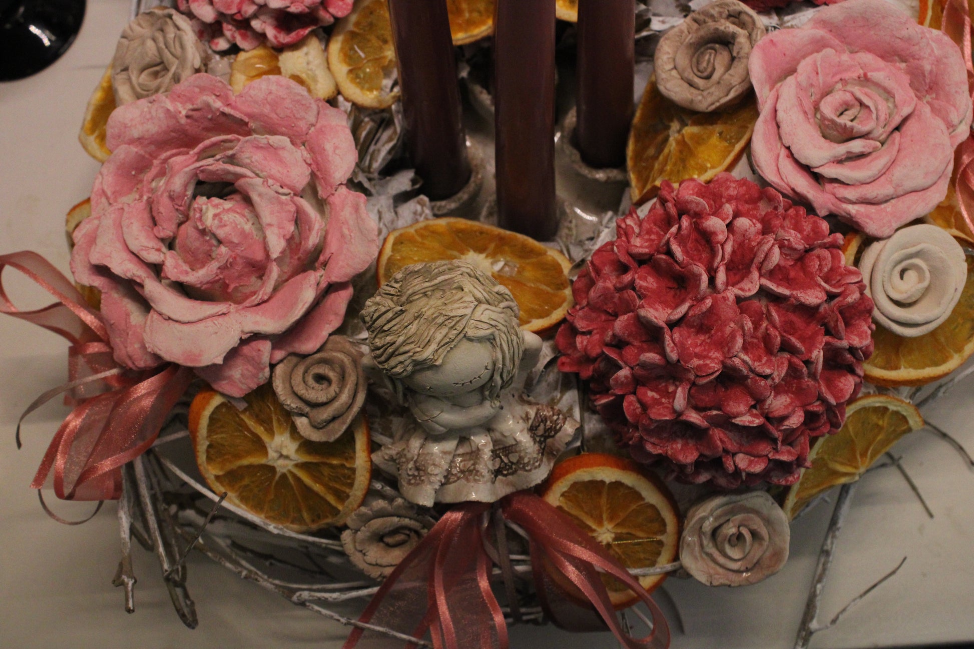 Ovaj romantični adventski vjenčić izrađen je od ručno modeliranih keramičkih elemenata: hortenzija, ružica i malog anđela u nježnim pastelnim tonovima. Keramika je obrađena engobama i zaštićena prozirnom glazurom, što daje trajnost i finoću svakom detalju.