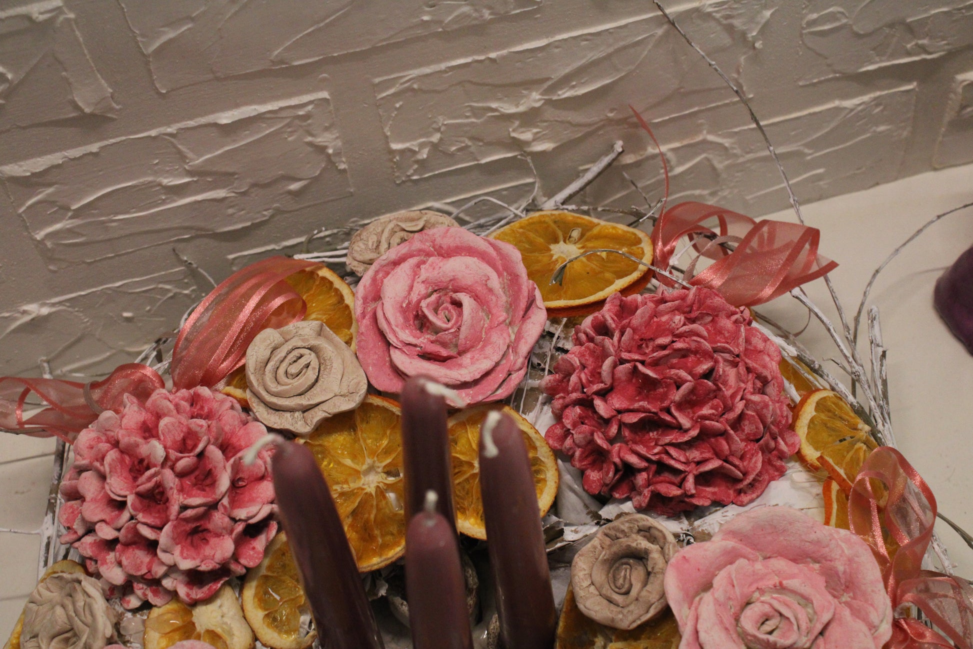 Uz keramičke cvjetove, vjenčić je obogaćen sušenim narančama, dekorativnim vrpcama i prirodnim teksturama koje stvaraju toplu, blagdansku atmosferu.